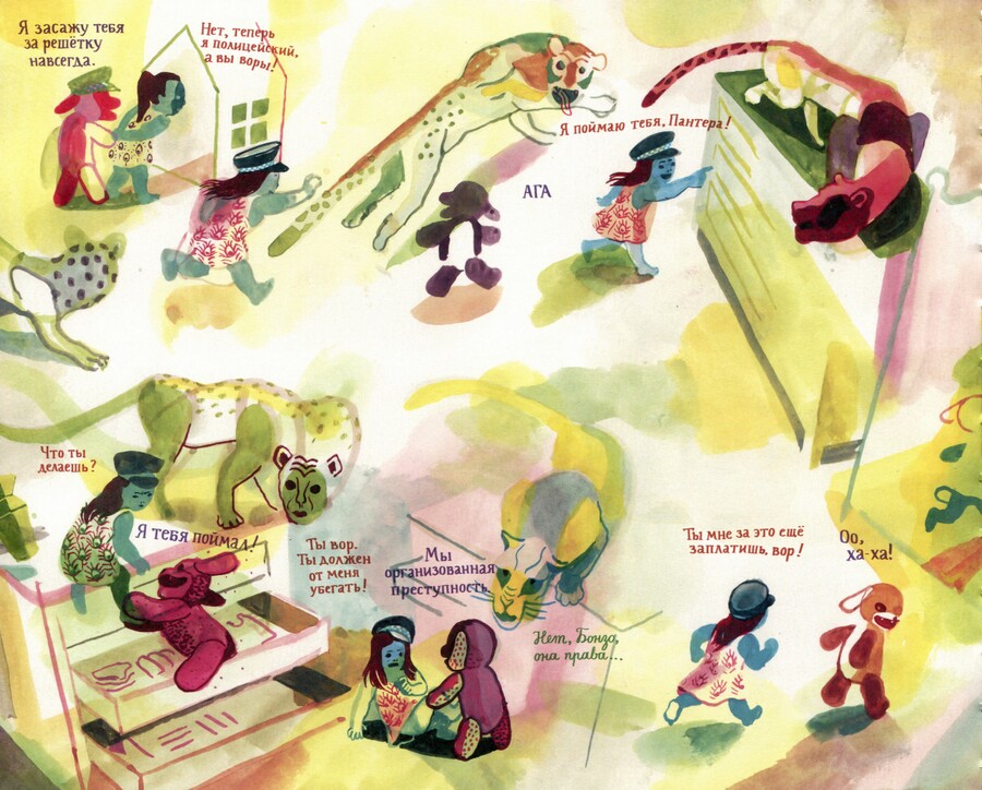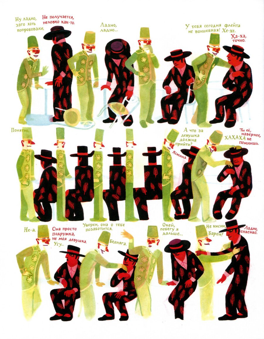 Мы привыкли видеть в комиксах чёткое разделение действий с помощью фреймов. Однако в этой книге они полностью отсутствуют. События буквально следуют друг за другом, иногда наслаиваясь одно на другое, что создаёт ощущение непрерывности и неразрывности временного потока.