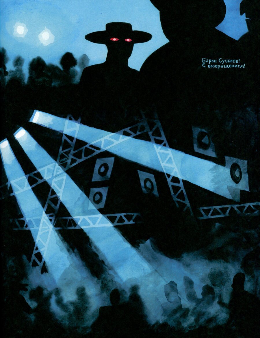 1. Барон Суббота в клубе; 2. Дорога в городе, переполненном машинами и людьми; 3. Сцена у бассейна