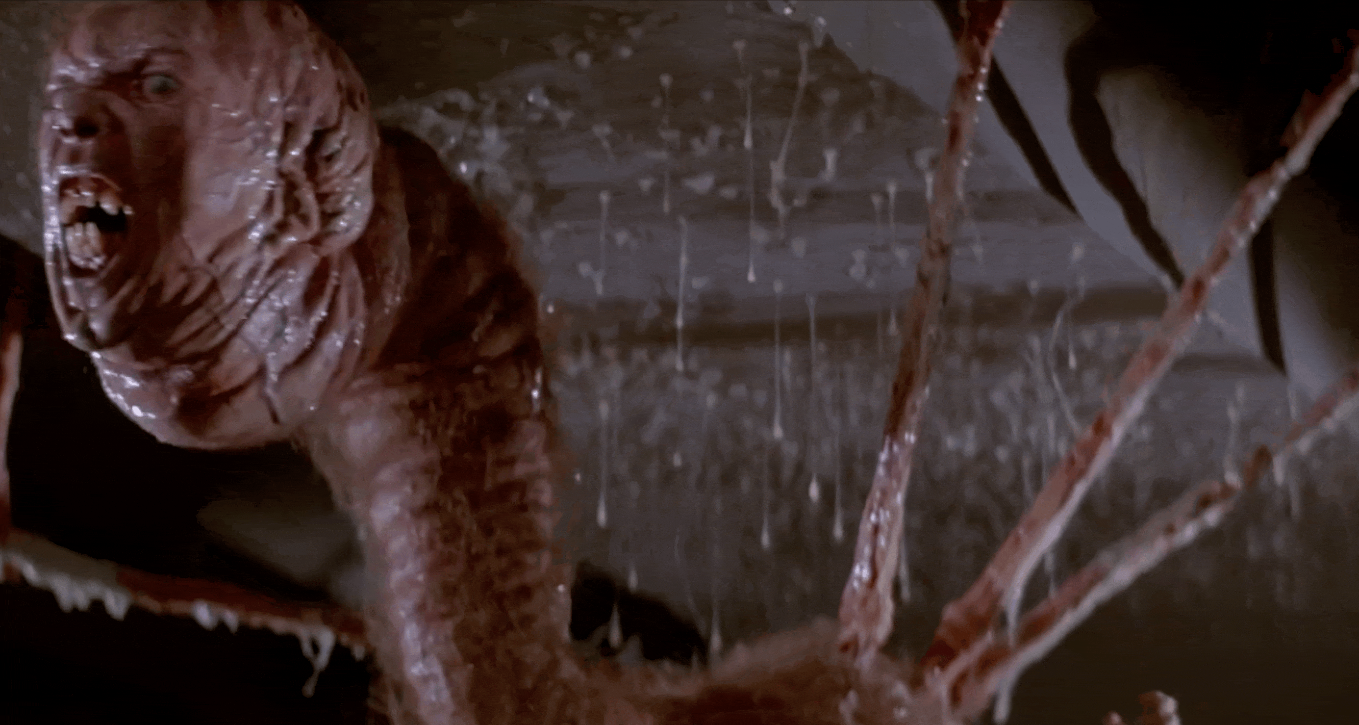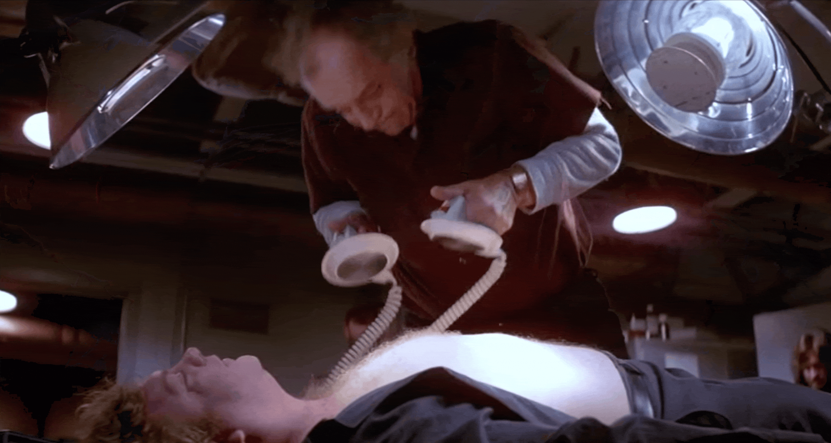 Была создана гидравлическая установка с силиконовой копией тела Чарльза Хэллахана. Оно было выполнено из стекловолокна, вспененного латекса, торчащие зубья — из акрила. Сам же актер находился под столом. Настоящими в кадре были лишь его голова, шея и плечи. В нужный момент установка разрывала силиконовую грудную клетку, откусывая руки доктора Коппера. Для достижения этого эффекта руки актера сняли с помощью дублёра-инвалида. К нему были прикреплены модели рук, наполненные искусственной кровью и парафиновыми костями, а на лицо была надета силиконовая маска с лицом Ричарда Дайсарта