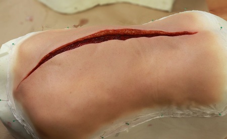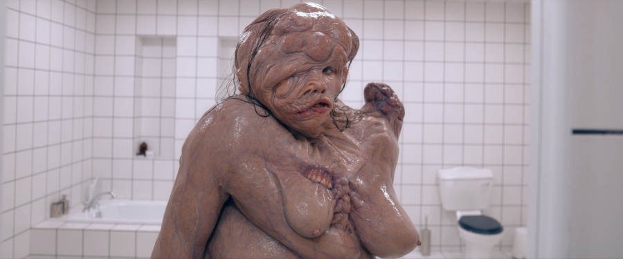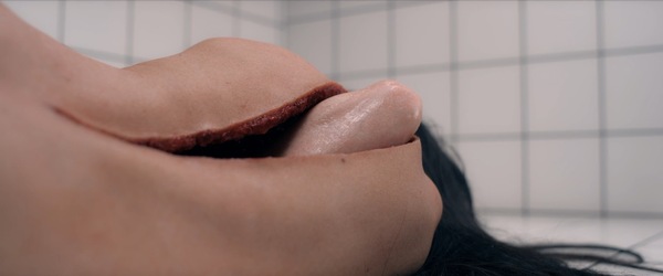 Пьер-Оливье Персен: «…когда создаешь накладки, они получаются очень-очень мягкими. Это силиконовый гель. Так что они очень эластичные и мягкие, но поскольку я знал, что это будут снимать крупным планом, я не хотел, чтобы при прокалывании ниткой кожа выглядела как пластик или слишком растяжимой — когда видишь, как игла проходит, и кожа сильно тянется, это раскрывает обман» В итоге это была мягкая накладка, на края раны нанесен специальный силикон, чтобы игла проходила реалистично, и у плоти была нужная текстура и подвижность Для всех этих скручиваний и странных движений под спиной, раскрытия, расщепления пополам, использовали два разных манекена. Команде пришлось приподнять съёмочную площадку, и художники находились под ней и анимировали большую куклу, чтобы добиться настоящей выразительности