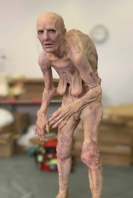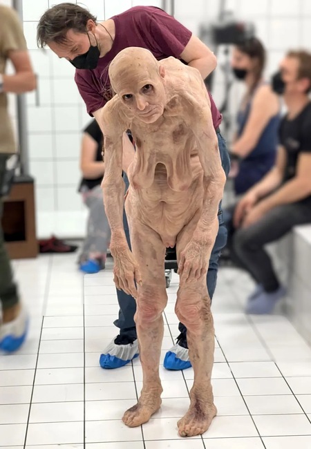 Для сцен с «Голлумом» помимо Деми Мур, был очень худой дублер-каскадёр без груди, с тонкими ногами, руками. Это было сделано для лучшего эффекта применения накладок, потому что они имеют достаточный объём, а важно было добиться истощенного, почти «паучьего» вида. Также сначала наносили на кожу грим с проработанными деталями, а уже потом поверх приклеивали накладки. Это позволяло создать полупрозрачный эффект, будто что-то проступает из-под кожи. Для вен и других деталей добавляли шерсть, разные цвета, наслаивая их под силикон. Персен: «Для меня было важно создать глубину и сложность — не только в деталях, но и в общей форме. На расстоянии персонаж должен выглядеть правдоподобно, но и крупным планом он должен оставаться интересным. Нам приходилось быть осторожными, потому что Корали использовала тесные крупные планы и жёсткое освещение, что усложняло задачу для накладок»