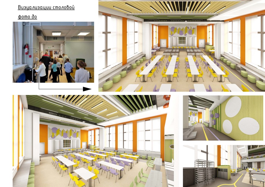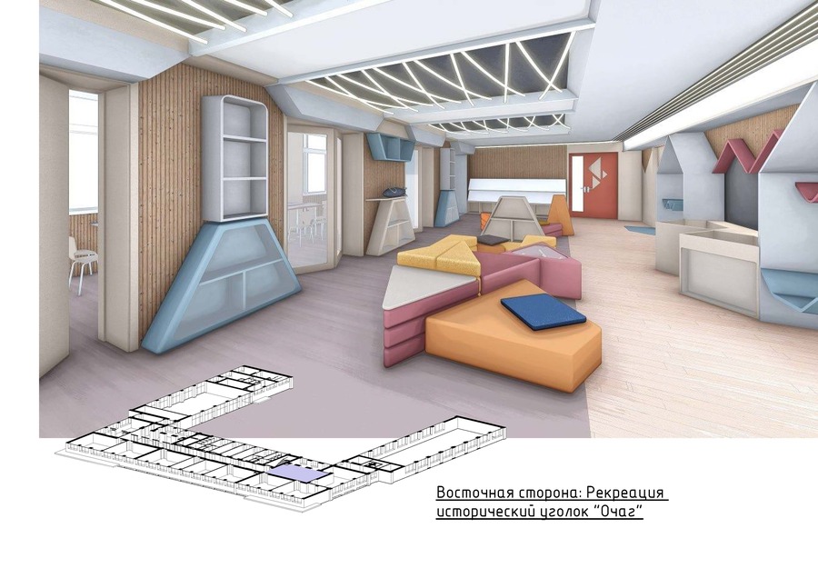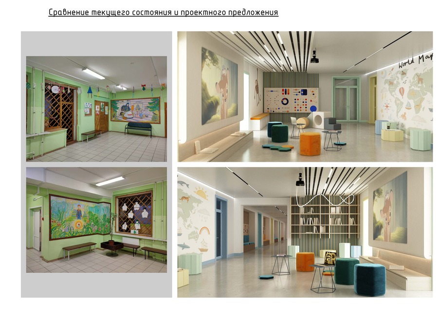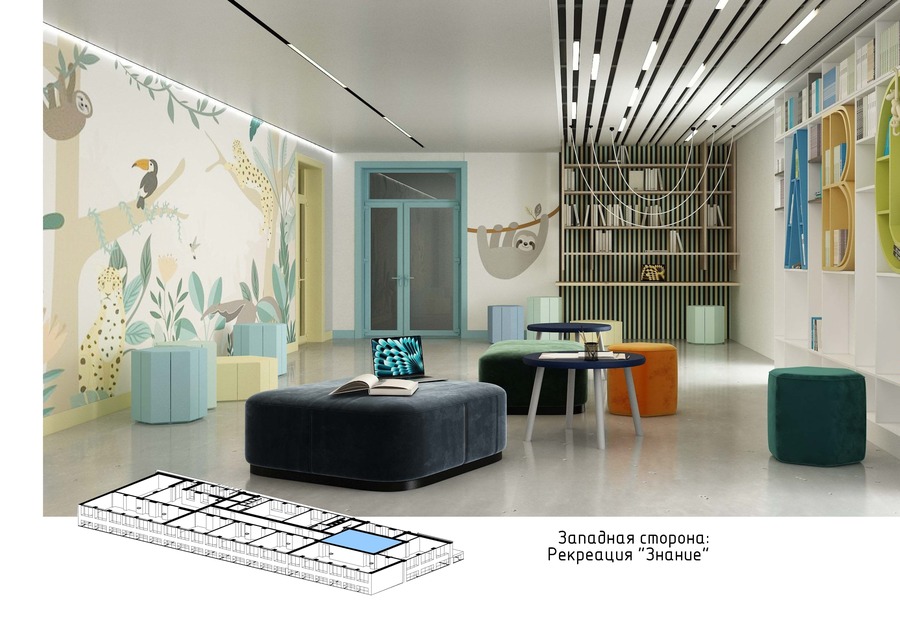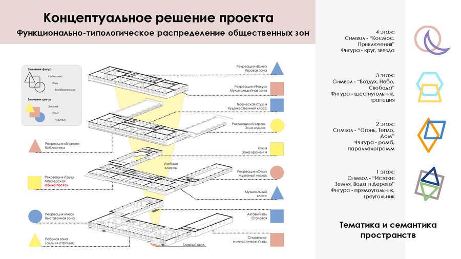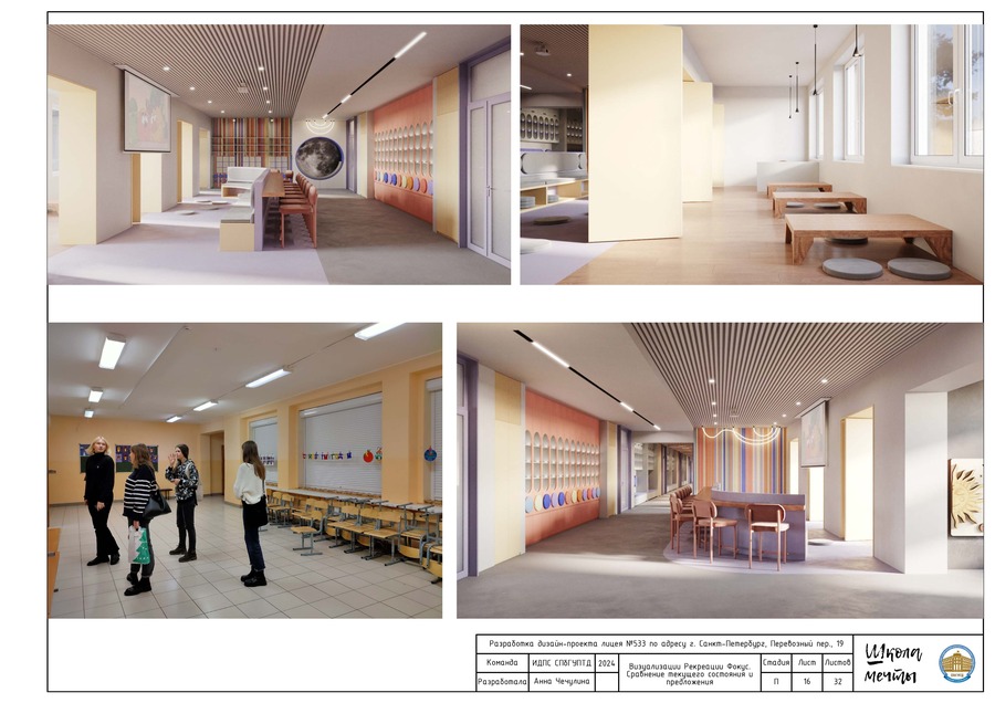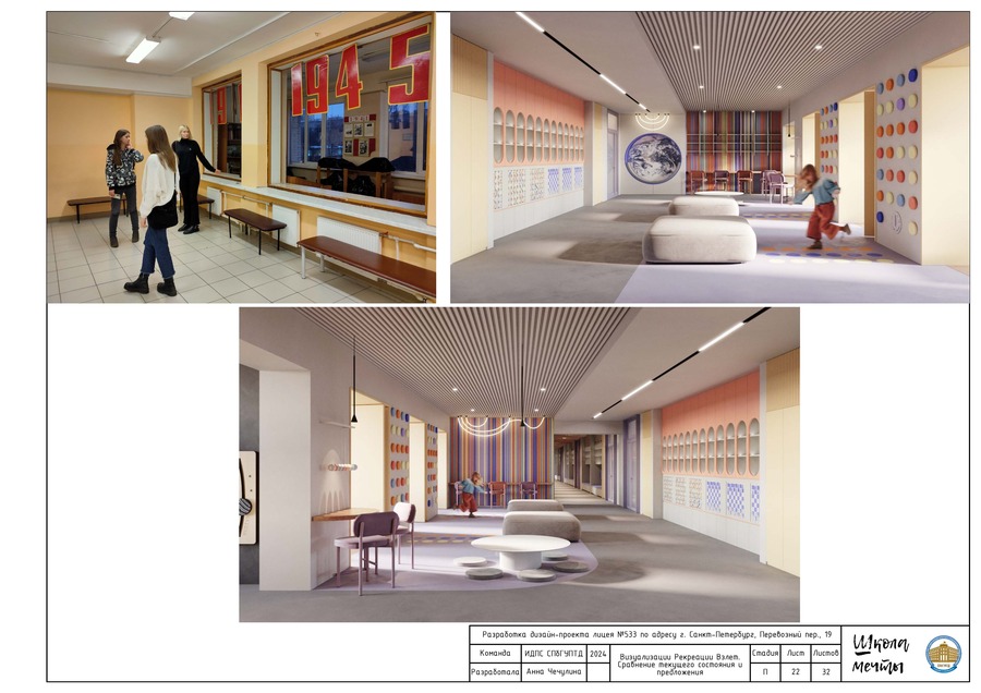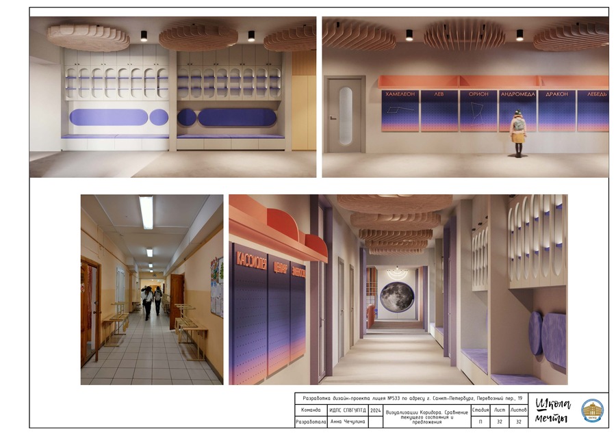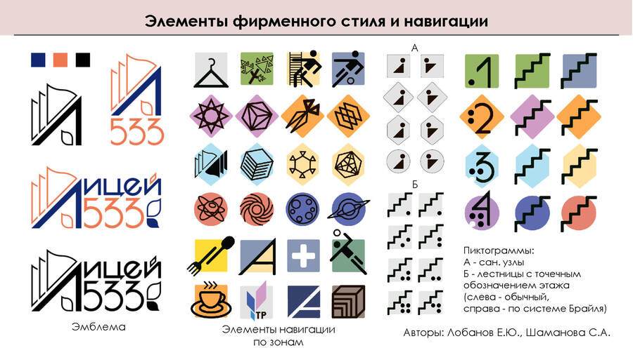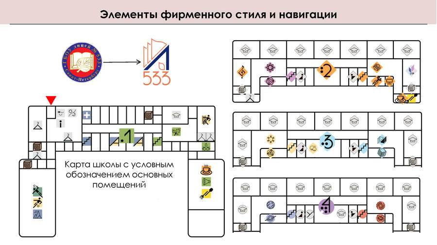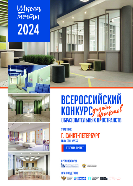 ГБОУ СОШ № 533 Первый логотип школы в виде книги с листом послужил источником вдохновения. Дети — это «чистые листы», которые открыты познанию окружающего мира. В основу концепции вошли стихии природы и обрели каждая свою форму в зависимости от расположения на этаже. Первый этаж символизирует начало, истоки, его элементы — земля, дерево и вода. Все административные помещения были перенесены в коридор первого этажа. Были добавлены акценты в виде сидений и настенное панно «Начало» в виде дерева, предназначенное для размещения фотографий и других самых важных моментов из жизни школы. Это символ связи между поколениями, и оно отлично дополняет административную функцию коридора. Символика второго этажа — огонь как источник тепла, очаг, вокруг которого собирается вся семья. Концепция интерьера третьего этажа символизирует свободу познания и творчества. Рекреация «Остров» погружает учеников в атмосферу сказки, а «Знание» представляет собой мини-библиотеку. Символика 4-го этажа — круг, космос. Рекреация «Фокус» представляет собой зону для просмотра мультфильмов, а «Взлет» является зоной активных игр. Лобановым Е.Ю. и Шамановой С. А. также были разработаны пристройка и инфографика.