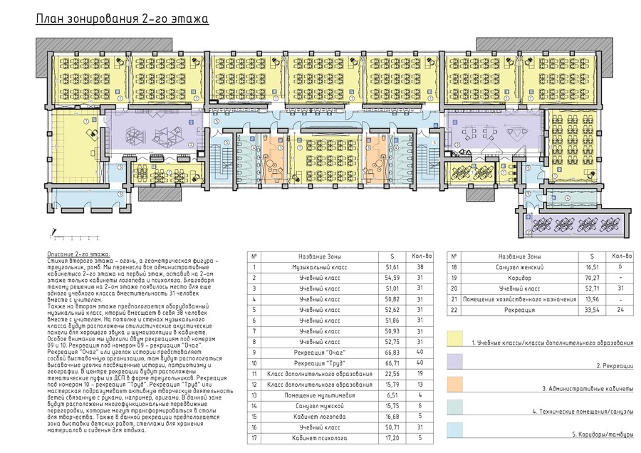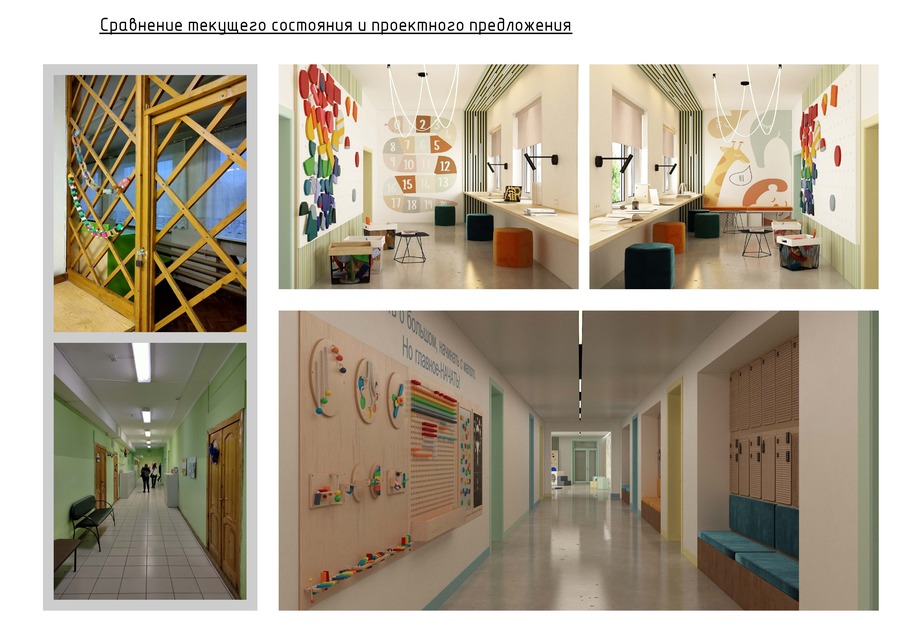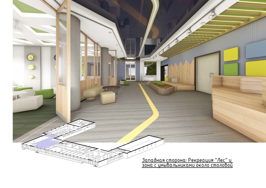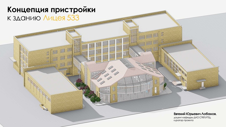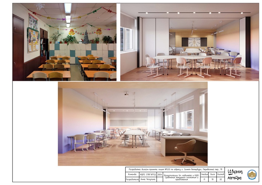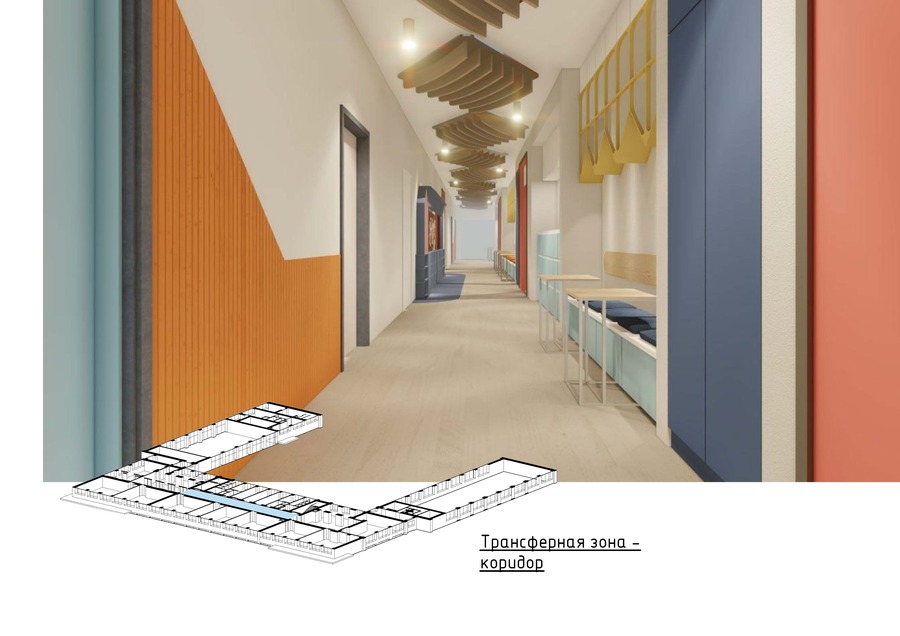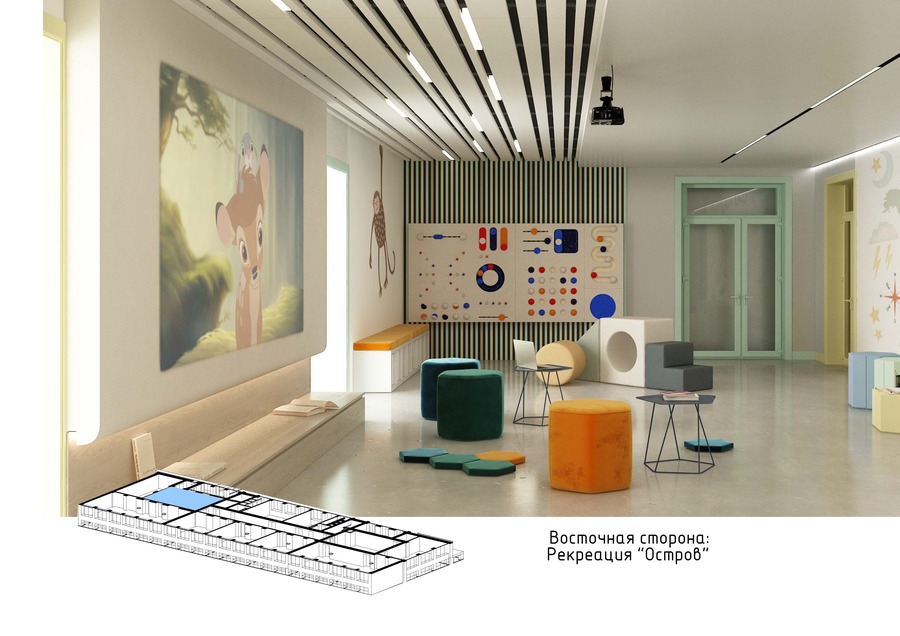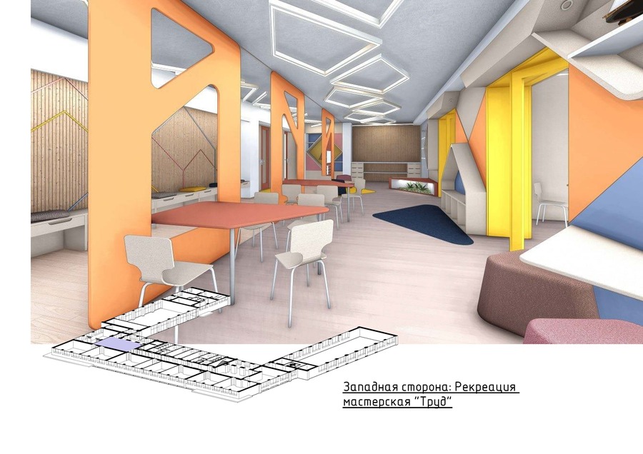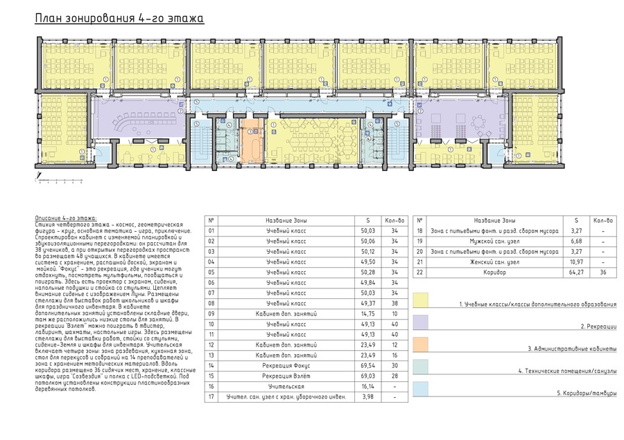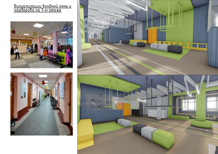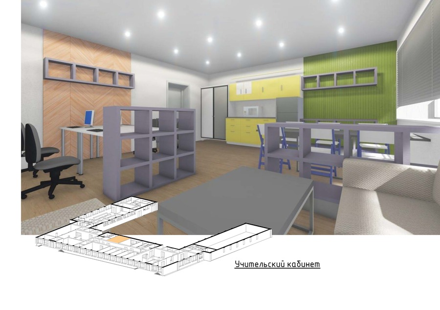 ГБОУ СОШ № 533 Первый логотип школы в виде книги с листом послужил источником вдохновения. Дети — это «чистые листы», которые открыты познанию окружающего мира. В основу концепции вошли стихии природы и обрели каждая свою форму в зависимости от расположения на этаже. Первый этаж символизирует начало, истоки, его элементы — земля, дерево и вода. Все административные помещения были перенесены в коридор первого этажа. Были добавлены акценты в виде сидений и настенное панно «Начало» в виде дерева, предназначенное для размещения фотографий и других самых важных моментов из жизни школы. Это символ связи между поколениями, и оно отлично дополняет административную функцию коридора. Символика второго этажа — огонь как источник тепла, очаг, вокруг которого собирается вся семья. Концепция интерьера третьего этажа символизирует свободу познания и творчества. Рекреация «Остров» погружает учеников в атмосферу сказки, а «Знание» представляет собой мини-библиотеку. Символика 4-го этажа — круг, космос. Рекреация «Фокус» представляет собой зону для просмотра мультфильмов, а «Взлет» является зоной активных игр. Лобановым Е.Ю. и Шамановой С. А. также были разработаны пристройка и инфографика.
