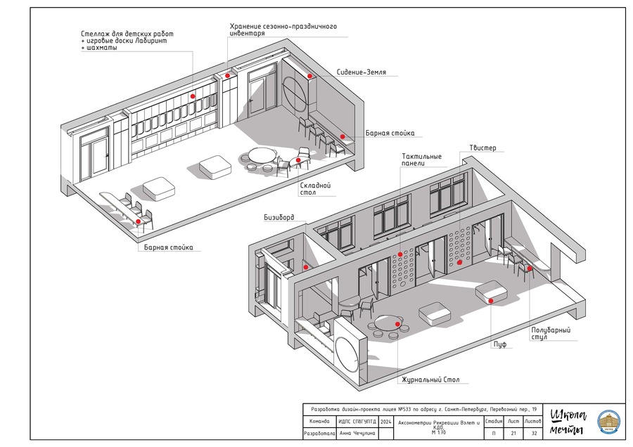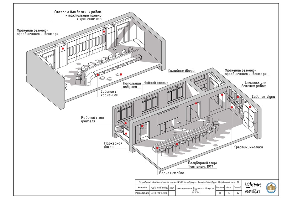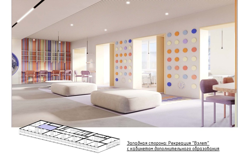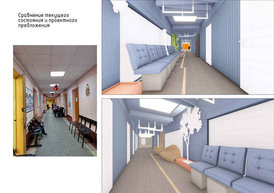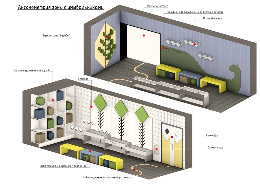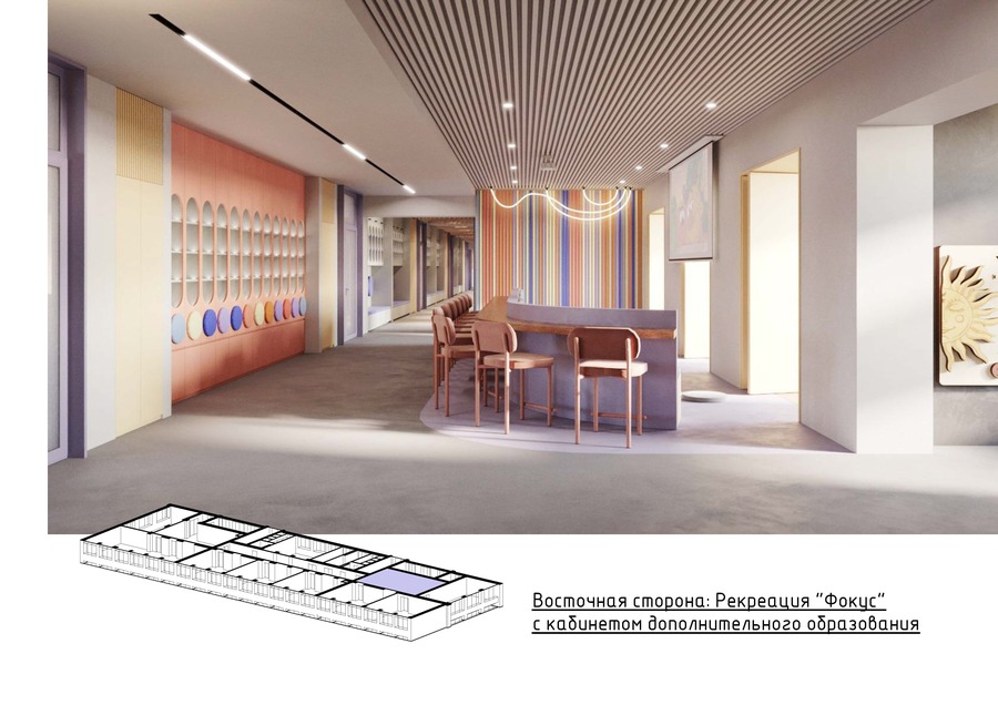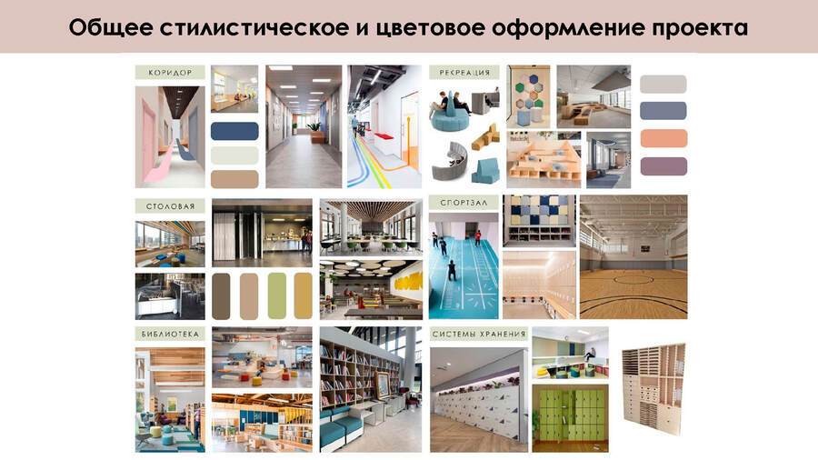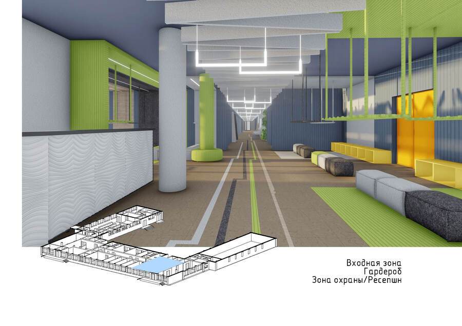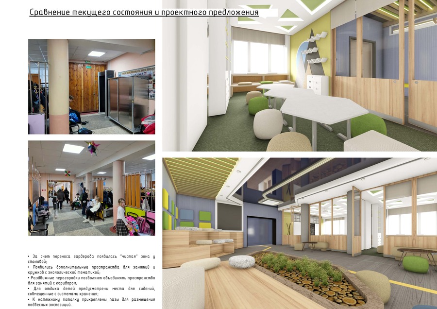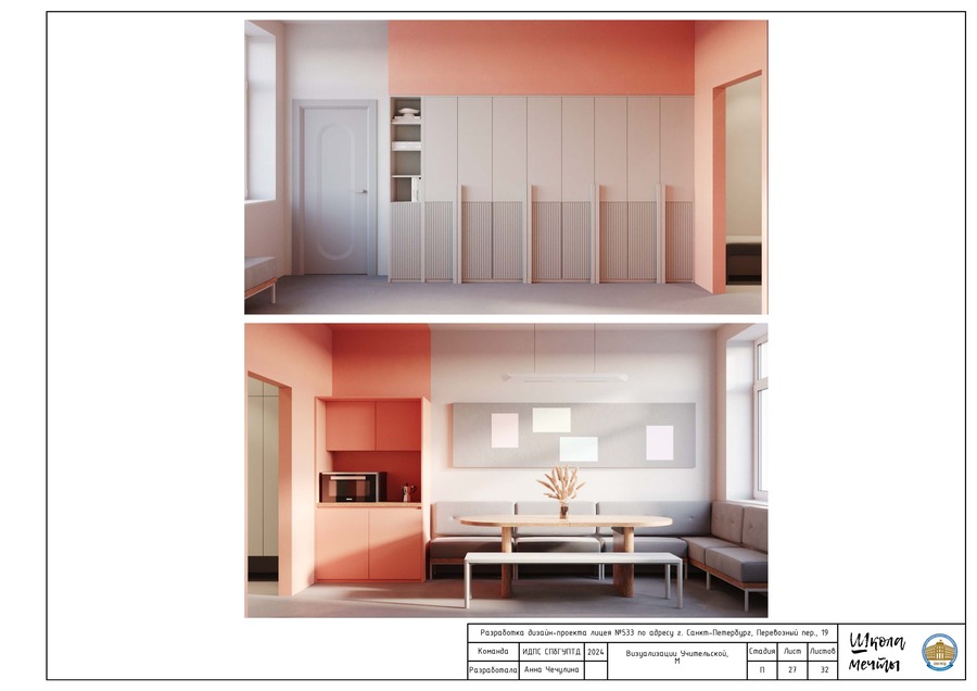 ГБОУ СОШ № 533 Первый логотип школы в виде книги с листом послужил источником вдохновения. Дети — это «чистые листы», которые открыты познанию окружающего мира. В основу концепции вошли стихии природы и обрели каждая свою форму в зависимости от расположения на этаже. Первый этаж символизирует начало, истоки, его элементы — земля, дерево и вода. Все административные помещения были перенесены в коридор первого этажа. Были добавлены акценты в виде сидений и настенное панно «Начало» в виде дерева, предназначенное для размещения фотографий и других самых важных моментов из жизни школы. Это символ связи между поколениями, и оно отлично дополняет административную функцию коридора. Символика второго этажа — огонь как источник тепла, очаг, вокруг которого собирается вся семья. Концепция интерьера третьего этажа символизирует свободу познания и творчества. Рекреация «Остров» погружает учеников в атмосферу сказки, а «Знание» представляет собой мини-библиотеку. Символика 4-го этажа — круг, космос. Рекреация «Фокус» представляет собой зону для просмотра мультфильмов, а «Взлет» является зоной активных игр. Лобановым Е.Ю. и Шамановой С. А. также были разработаны пристройка и инфографика.