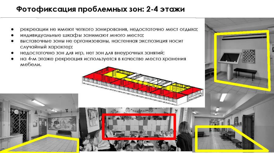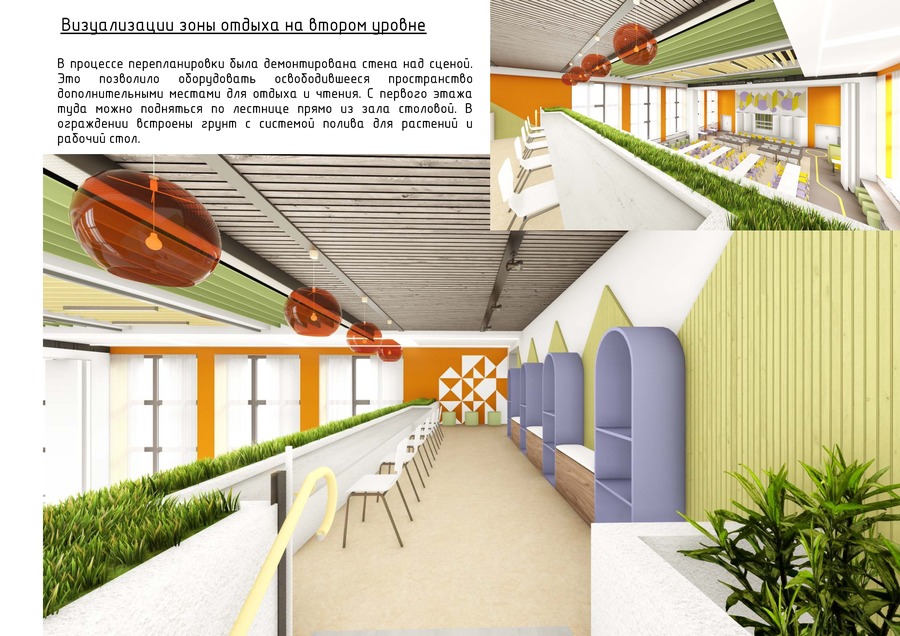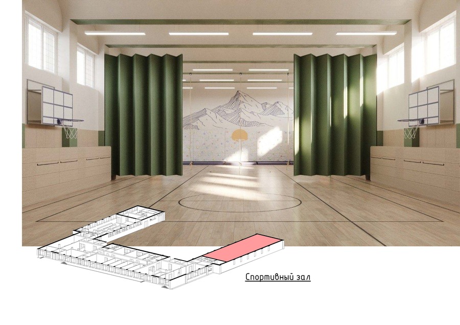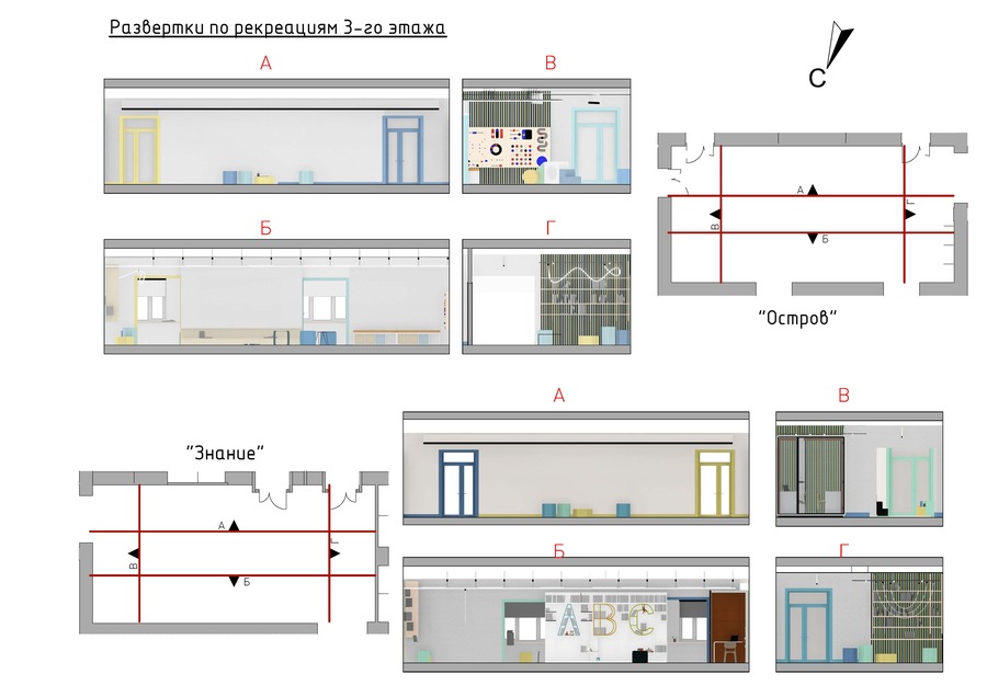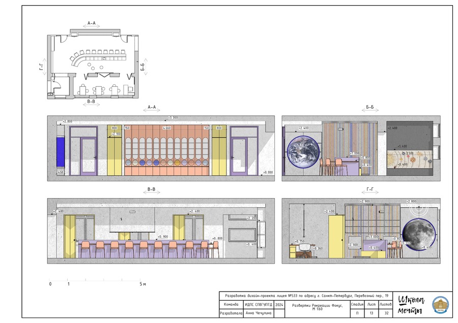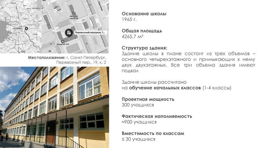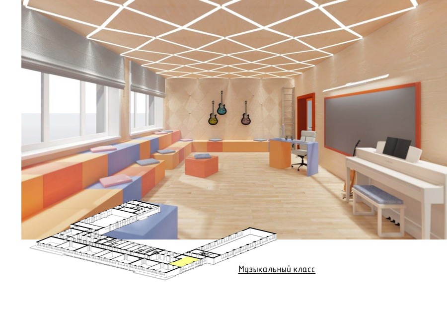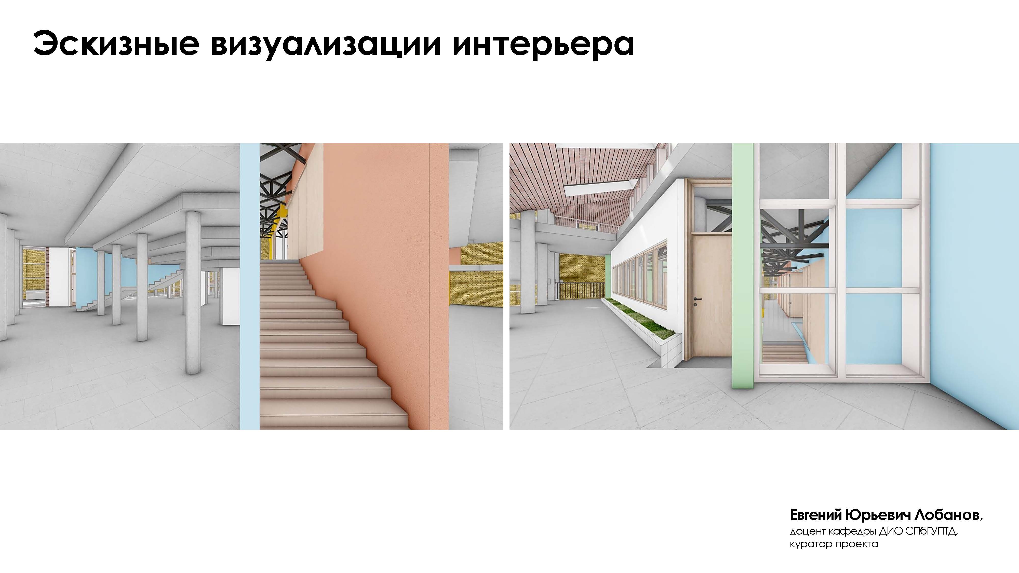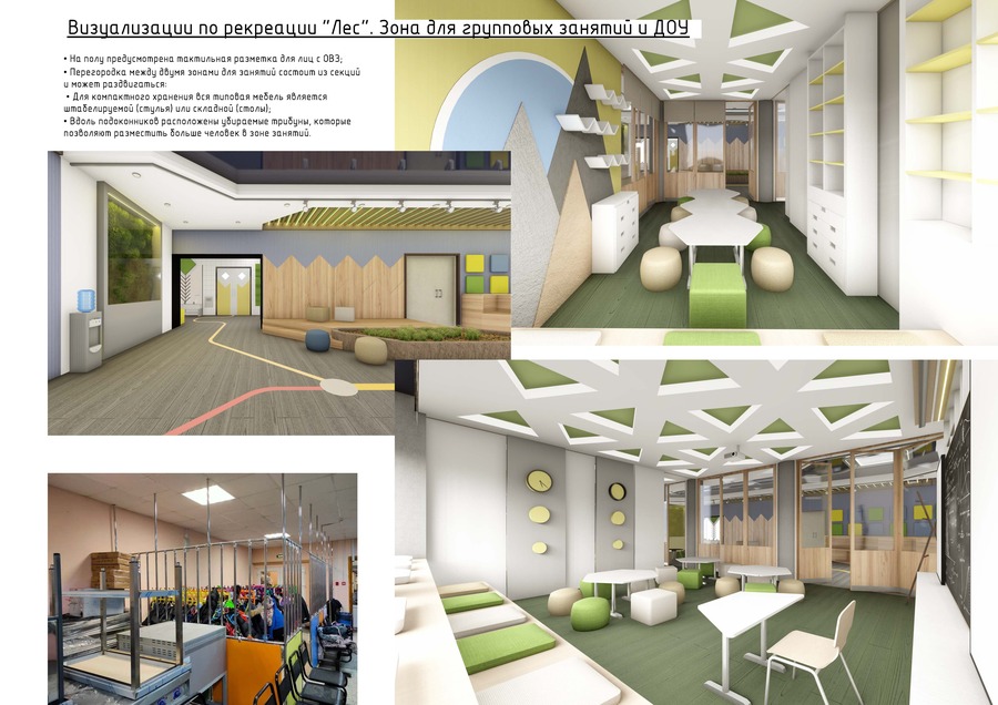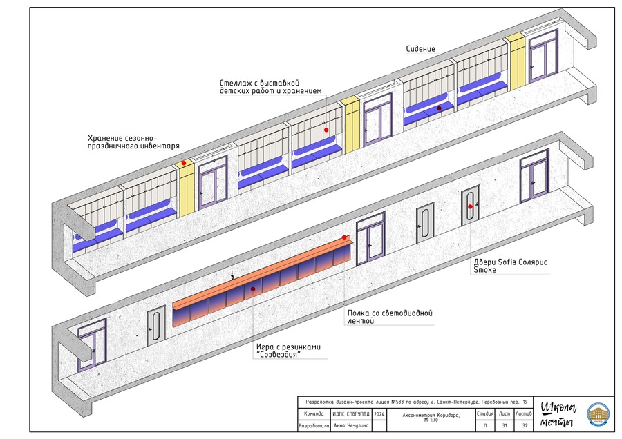 ГБОУ СОШ № 533 Первый логотип школы в виде книги с листом послужил источником вдохновения. Дети — это «чистые листы», которые открыты познанию окружающего мира. В основу концепции вошли стихии природы и обрели каждая свою форму в зависимости от расположения на этаже. Первый этаж символизирует начало, истоки, его элементы — земля, дерево и вода. Все административные помещения были перенесены в коридор первого этажа. Были добавлены акценты в виде сидений и настенное панно «Начало» в виде дерева, предназначенное для размещения фотографий и других самых важных моментов из жизни школы. Это символ связи между поколениями, и оно отлично дополняет административную функцию коридора. Символика второго этажа — огонь как источник тепла, очаг, вокруг которого собирается вся семья. Концепция интерьера третьего этажа символизирует свободу познания и творчества. Рекреация «Остров» погружает учеников в атмосферу сказки, а «Знание» представляет собой мини-библиотеку. Символика 4-го этажа — круг, космос. Рекреация «Фокус» представляет собой зону для просмотра мультфильмов, а «Взлет» является зоной активных игр. Лобановым Е.Ю. и Шамановой С. А. также были разработаны пристройка и инфографика.