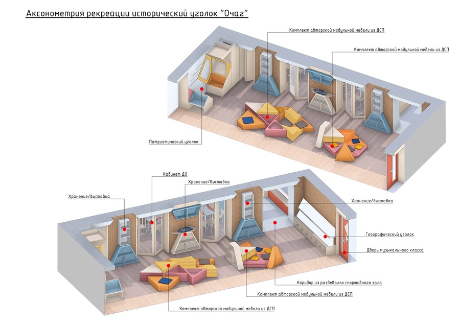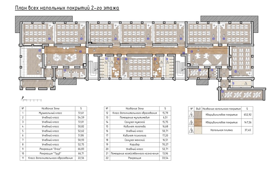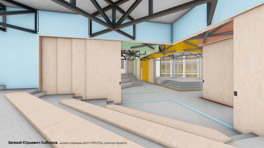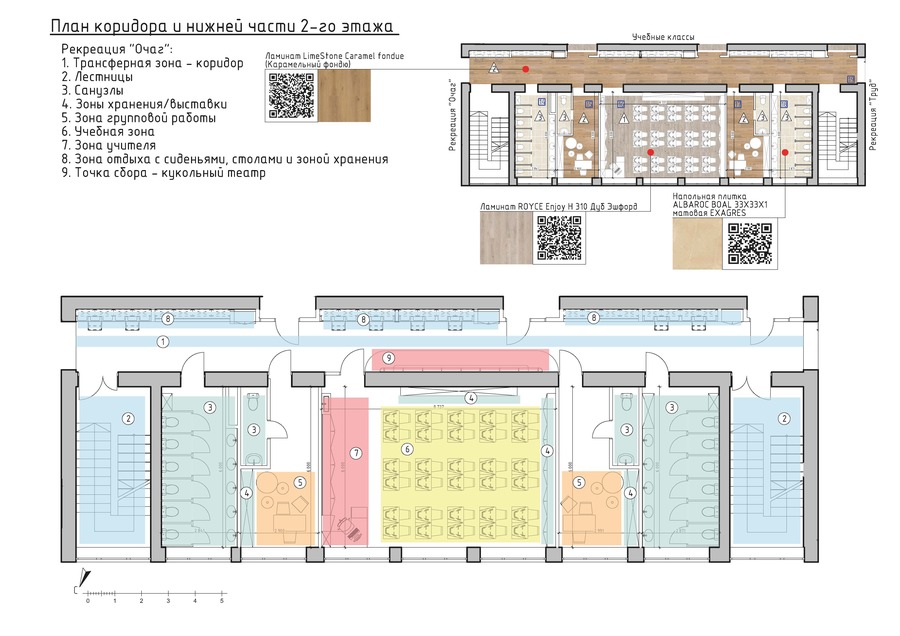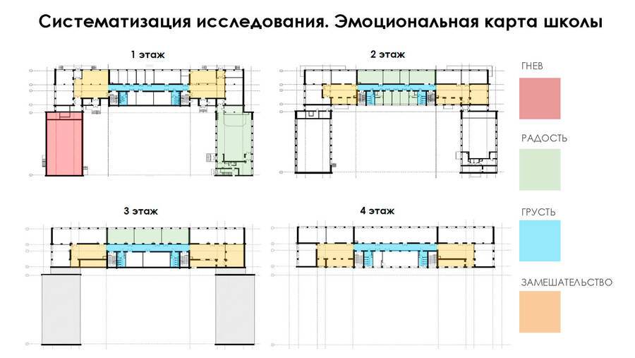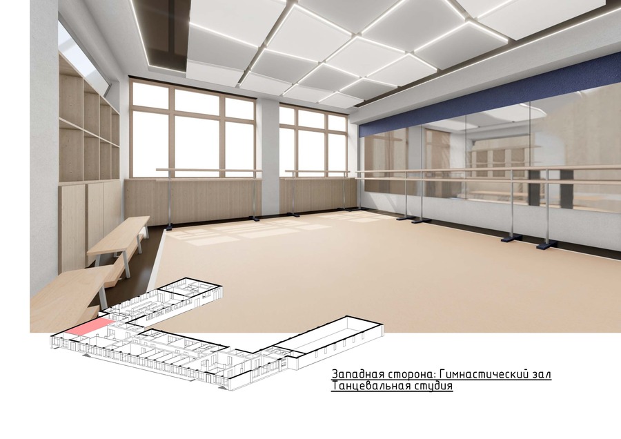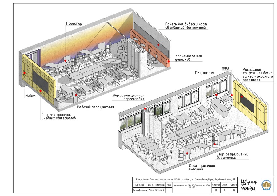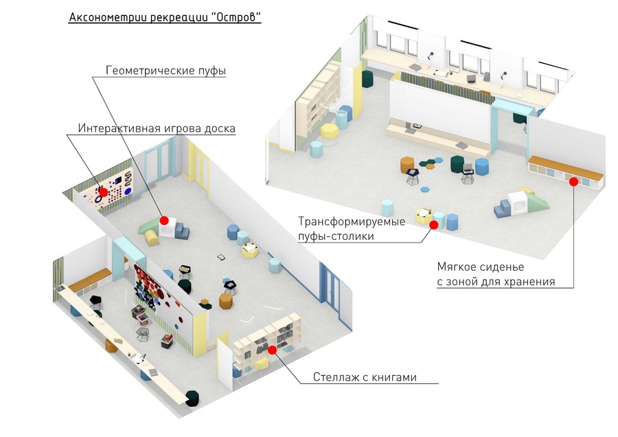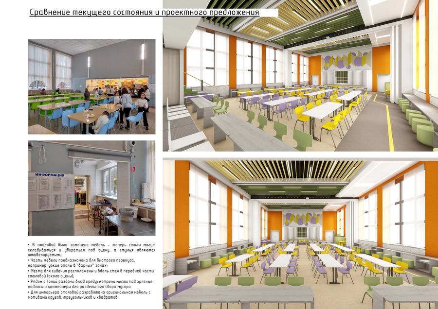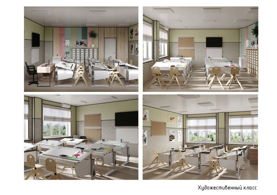 ГБОУ СОШ № 533 Первый логотип школы в виде книги с листом послужил источником вдохновения. Дети — это «чистые листы», которые открыты познанию окружающего мира. В основу концепции вошли стихии природы и обрели каждая свою форму в зависимости от расположения на этаже. Первый этаж символизирует начало, истоки, его элементы — земля, дерево и вода. Все административные помещения были перенесены в коридор первого этажа. Были добавлены акценты в виде сидений и настенное панно «Начало» в виде дерева, предназначенное для размещения фотографий и других самых важных моментов из жизни школы. Это символ связи между поколениями, и оно отлично дополняет административную функцию коридора. Символика второго этажа — огонь как источник тепла, очаг, вокруг которого собирается вся семья. Концепция интерьера третьего этажа символизирует свободу познания и творчества. Рекреация «Остров» погружает учеников в атмосферу сказки, а «Знание» представляет собой мини-библиотеку. Символика 4-го этажа — круг, космос. Рекреация «Фокус» представляет собой зону для просмотра мультфильмов, а «Взлет» является зоной активных игр. Лобановым Е.Ю. и Шамановой С. А. также были разработаны пристройка и инфографика.
