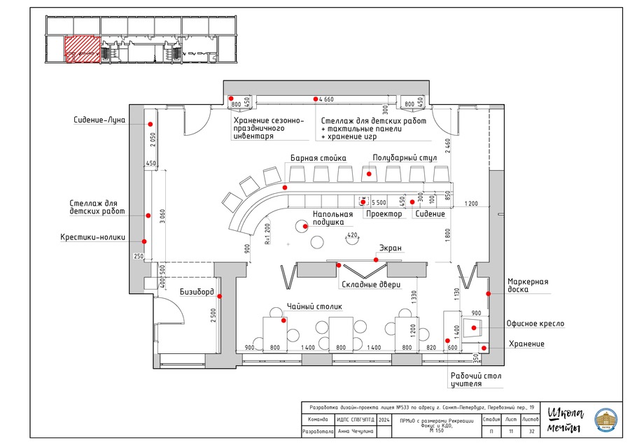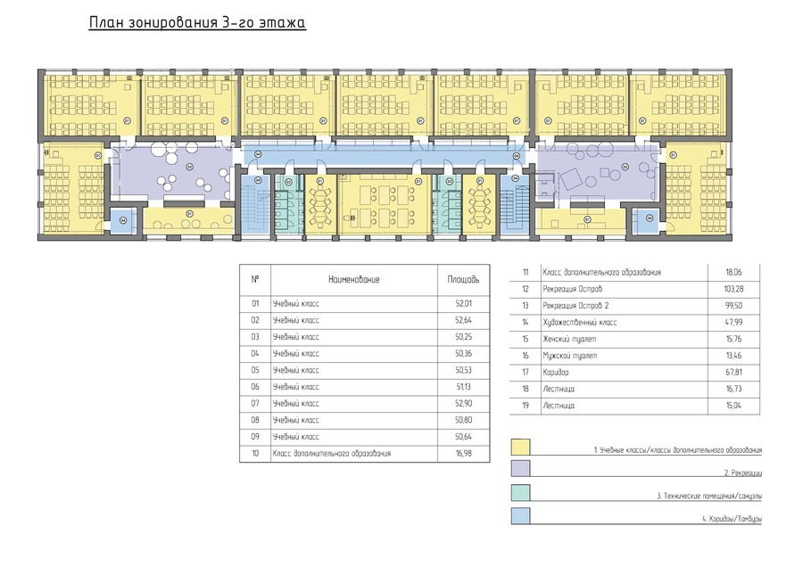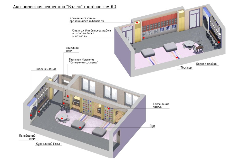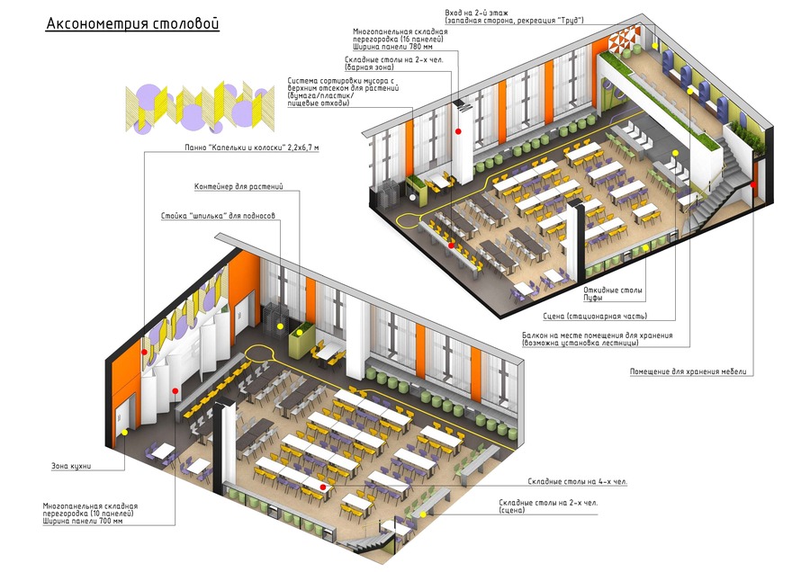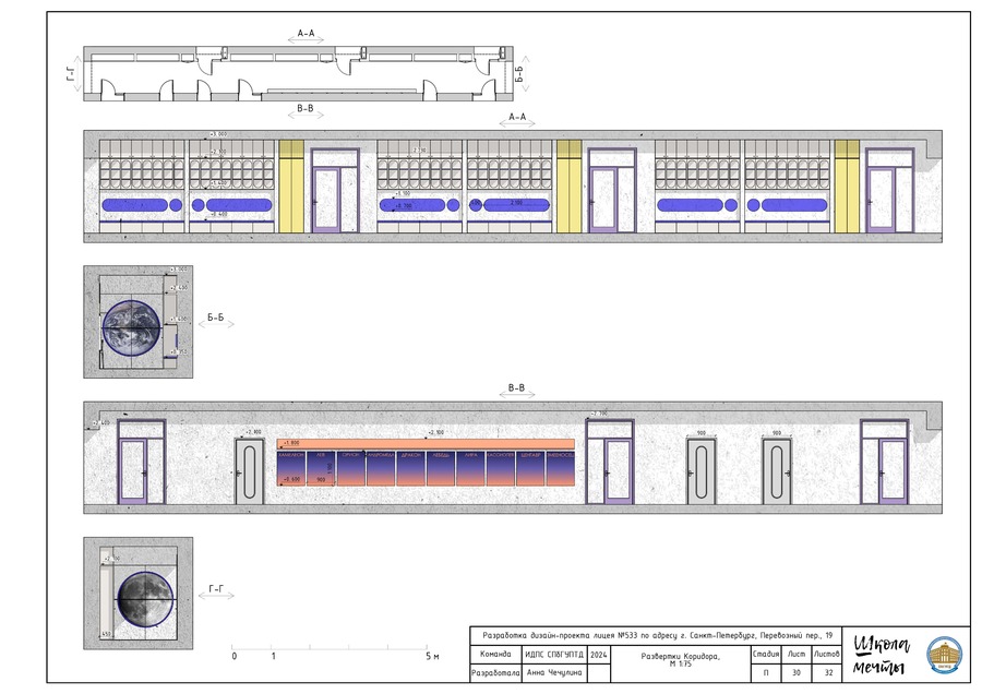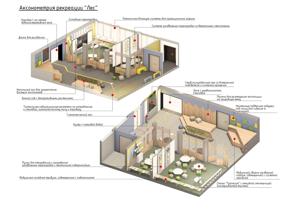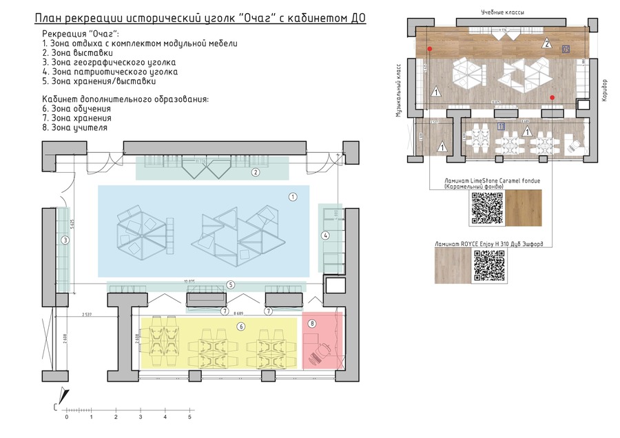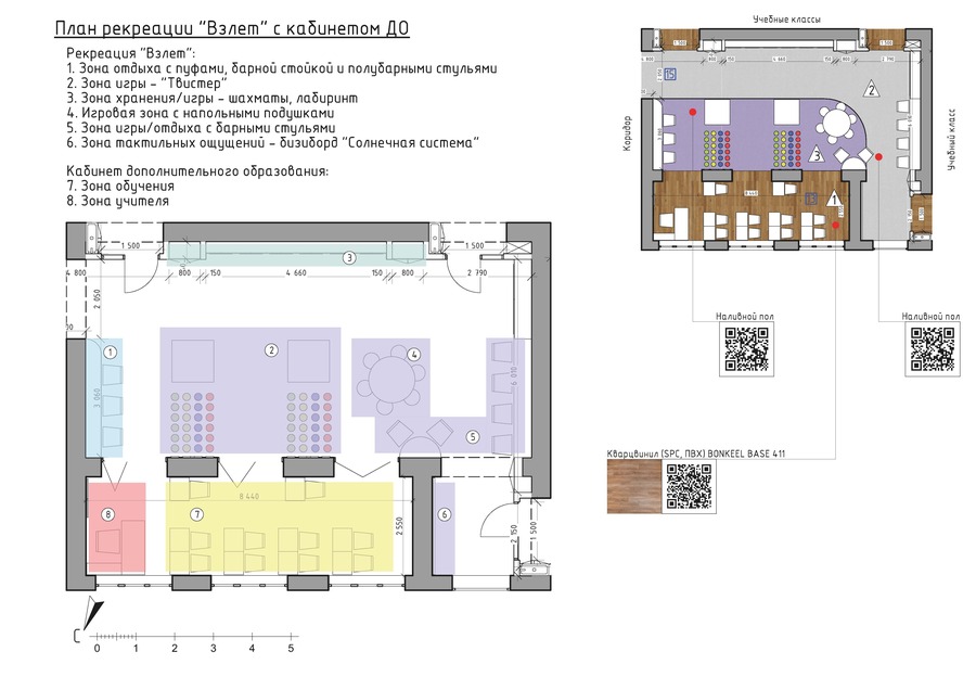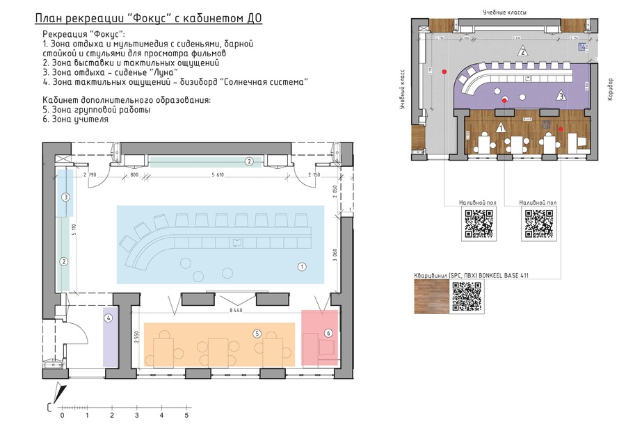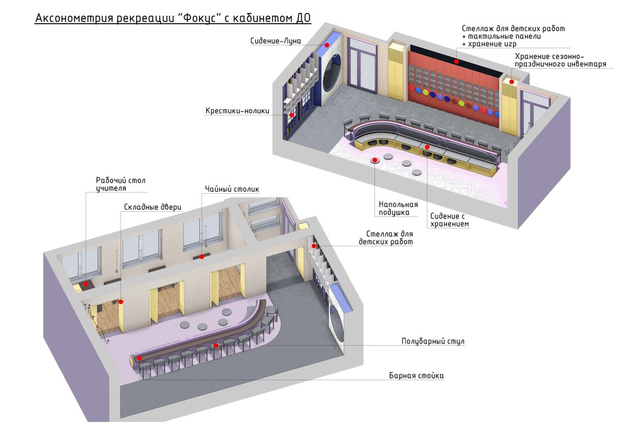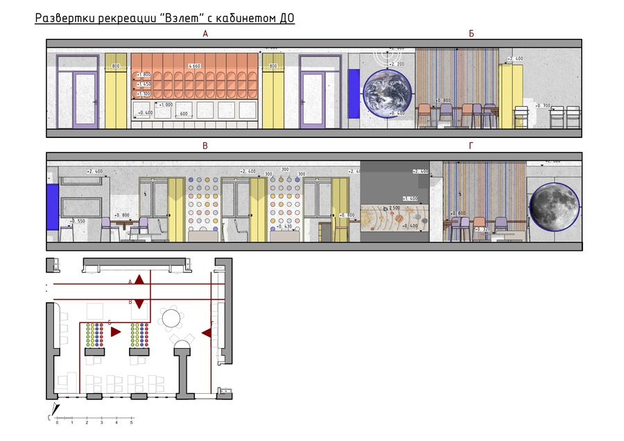 ГБОУ СОШ № 533 Первый логотип школы в виде книги с листом послужил источником вдохновения. Дети — это «чистые листы», которые открыты познанию окружающего мира. В основу концепции вошли стихии природы и обрели каждая свою форму в зависимости от расположения на этаже. Первый этаж символизирует начало, истоки, его элементы — земля, дерево и вода. Все административные помещения были перенесены в коридор первого этажа. Были добавлены акценты в виде сидений и настенное панно «Начало» в виде дерева, предназначенное для размещения фотографий и других самых важных моментов из жизни школы. Это символ связи между поколениями, и оно отлично дополняет административную функцию коридора. Символика второго этажа — огонь как источник тепла, очаг, вокруг которого собирается вся семья. Концепция интерьера третьего этажа символизирует свободу познания и творчества. Рекреация «Остров» погружает учеников в атмосферу сказки, а «Знание» представляет собой мини-библиотеку. Символика 4-го этажа — круг, космос. Рекреация «Фокус» представляет собой зону для просмотра мультфильмов, а «Взлет» является зоной активных игр. Лобановым Е.Ю. и Шамановой С. А. также были разработаны пристройка и инфографика.