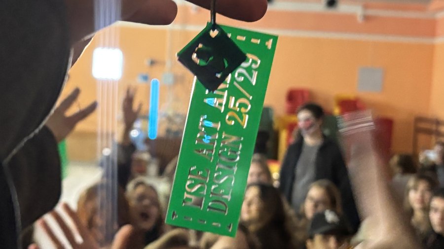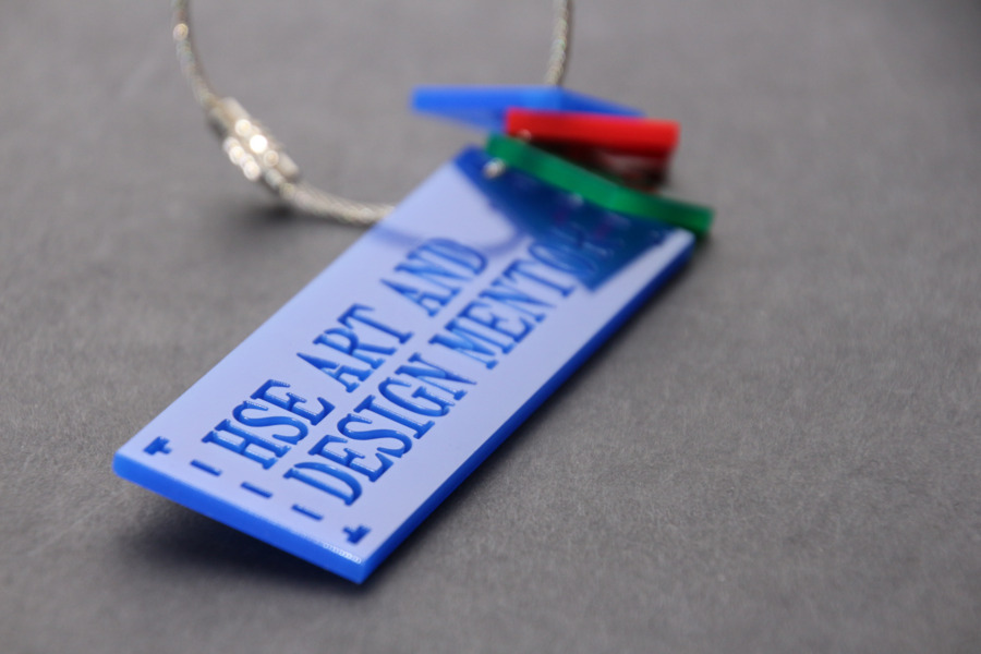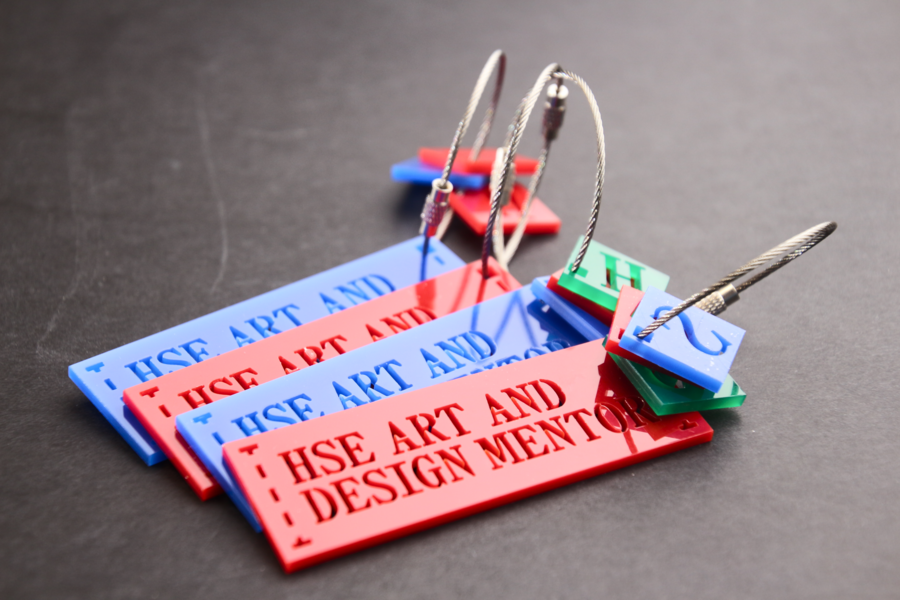 Съездив на производство, было вырезано в сумме 140 брелков из трех листов цветного оргстекла, 92 для первокурсников, 18 для менторов и 30 букв HSE.