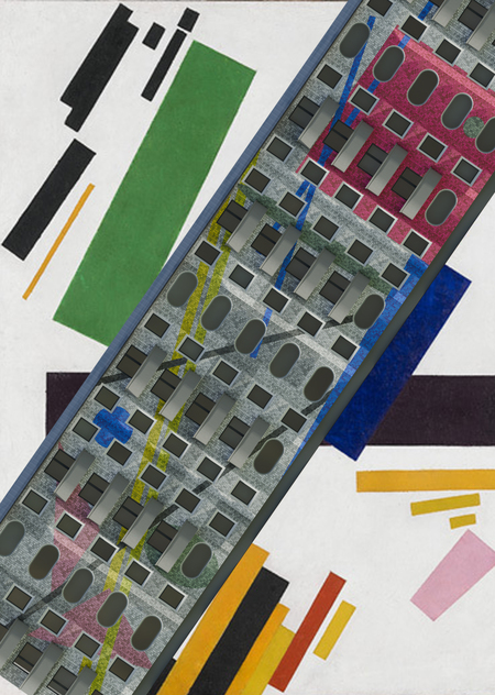 Проект «Супрематическая хрущевка» представляет собой радикальный эксперимент по трансформации типовой архитектуры в духе русского авангарда. Концепция строится на идее превращения утилитарного жилого здания в динамическую композицию, вдохновленную супрематизмом Малевича и конструктивистскими принципами.