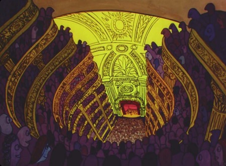 Интересно, как стиль не обязывает прорисовать фон: если нужно прорисовать толпу — можно просто нарисовать кучу геометрических фигур на фоне, если нужно нарисовать дом изнутри — можно сделать сплошную заливку и нарисовать одно окно и люстру. Остальные детали наш мозг дорисует сам. Более того, это упрощает работу аниматора с пространством, позволяя ему менять законы перспективы под себя.