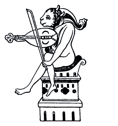 1- Игрец на ротте. Контурная прорисовка миниатюры из рукописи XII в. 2- Скульптура из Амьенского собора XIII в., изображающая чертёнка с трехструнной виелой. Из книги Сапонова «Менестрели»