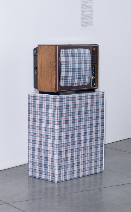 Мы напоминаем лакановский объект, А выпавший из символического, где «поле Реального» возможно только символического, посредством выпадения объекта А, который, однако, задает угол зрения. Да, сумка первых постсоветских челноков все еще с нами проросшая цветными полосами испытательной таблицы советского телевизора. Но в работе есть предощущение надежды на то, что во время выставки deus ex machina от Бэнкси разрежет навязчивый орнамент и действие изменит позицию наблюдателя.