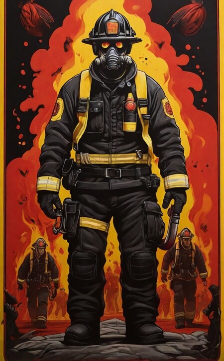 Фигурка пожарного, промпт: A figurine of a fireman. It is made in black, red and yellow only.