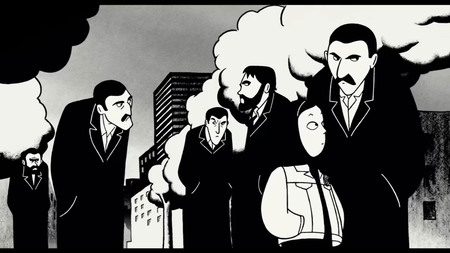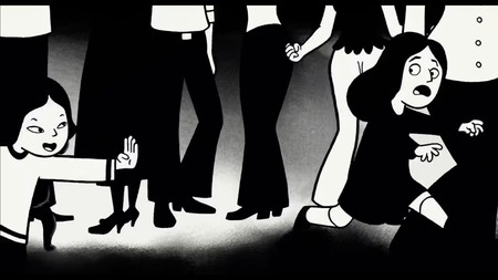 «Персеполис» (Маржан Сатрапи, 2007). Все одеты в чадру — это контрастирует с одеждами из самого начала анимации.