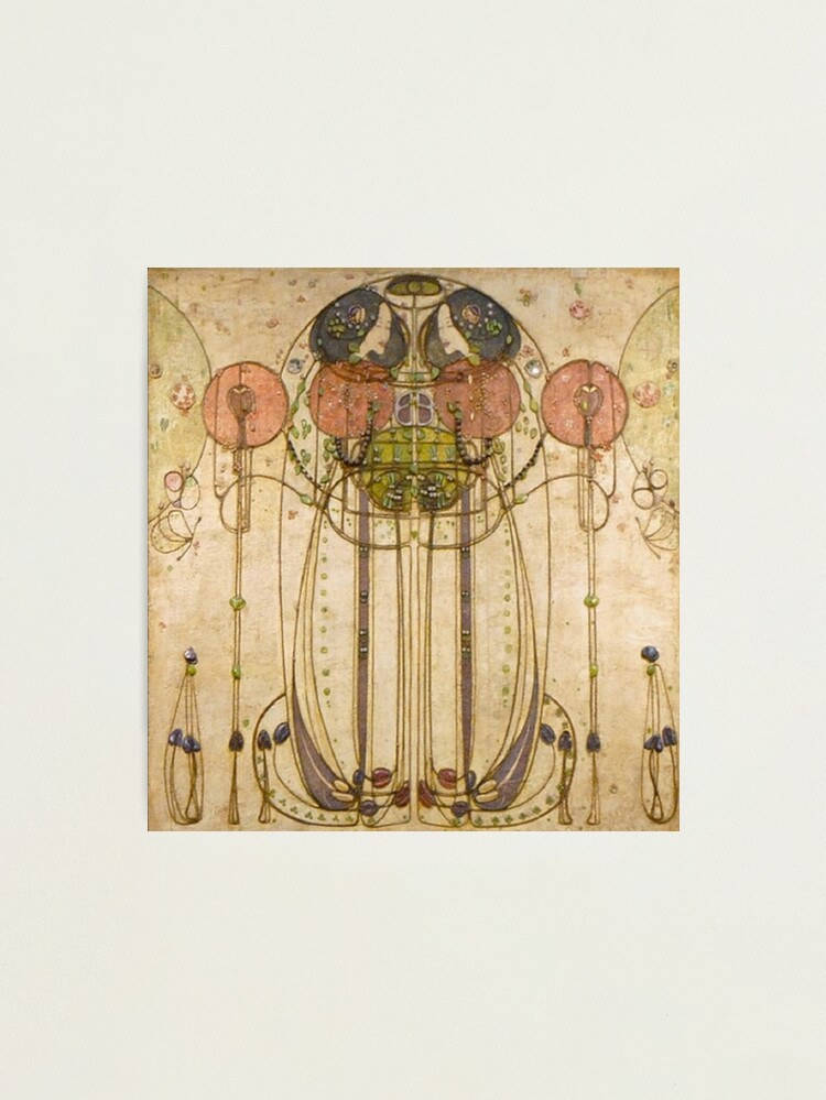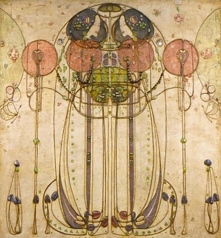 Вытянутые, иероглифичные фигуры напоминают силуэты египетских богинь и жриц. Статичность поз, удлинённые пропорции, фронтальность и ощущение «ритуального» действа отсылают к языку древних настенных росписей. Однако Макинтош переводит эти мотивы в модернистскую плоскость — линия растягивается, становится графичной, почти абстрактной.