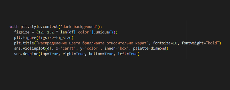 Анализ датасета позволил глубже понять ключевые характеристики, влияющие на их ценность. С помощью визуализации данных я рассмотрела распределение веса (карата), огранки, цвета и чистоты, а также выявили закономерности между этими различными параметрами.