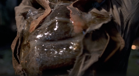 Стоит отметить, что поскольку в 90е, когда снимался фильм, компьютерная графика уже стала частью производственного процесса, то в первой части фильма появляются VFX в постобработке, например в момент взрыва персонажа или дорисовка и анимация отдельных частей монстров, где аниматроника справиться уже не могла.