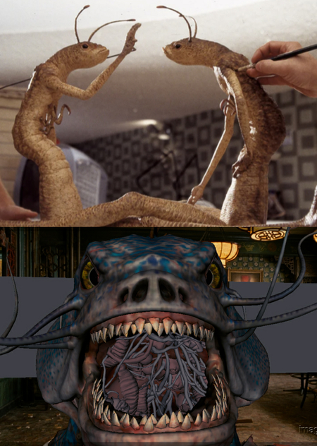 Для этих персонажей цифровая доработка была минимальной. VFX‑студия ILM, под руководством Эрика Бревига, использовала CGI только для сцен, где практическая аниматроника не позволяла сделать сложные движения или множественные экземпляры одновременно. Например, при панорамной сцене с большим количеством червей, либо при резком ускорении движения, компьютерная модель дополняла практические куклы, чтобы сохранить целостность кадра.