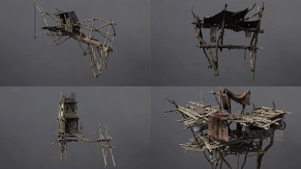 Слева: Текстурирование и освещение модели Города Гоблинов Справа: Отдельные модели — части построек в Городе Гоблинов
