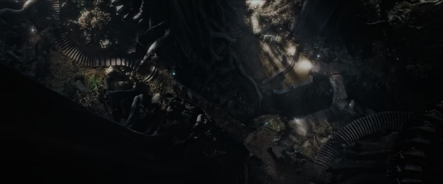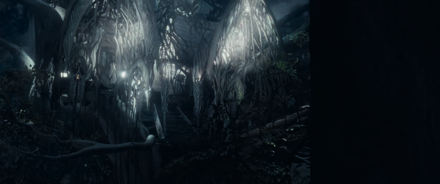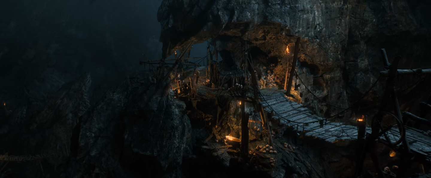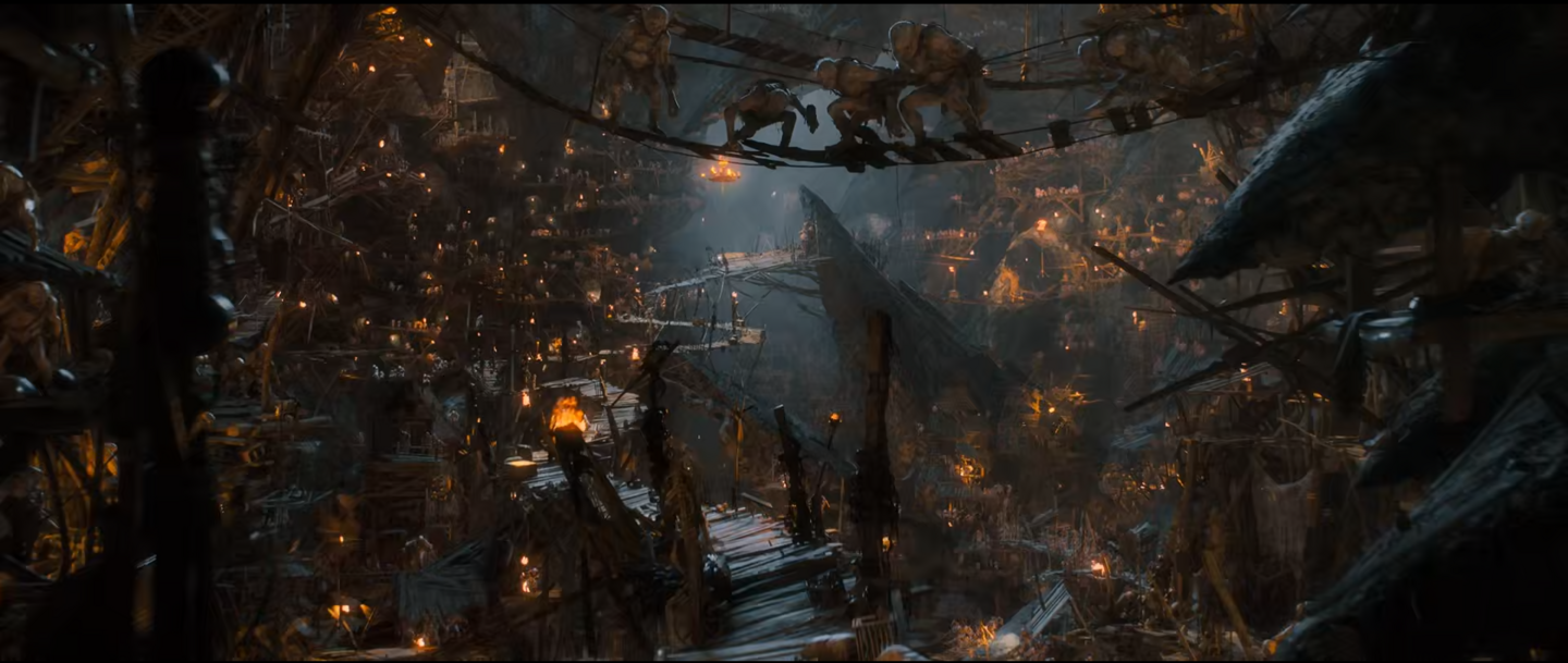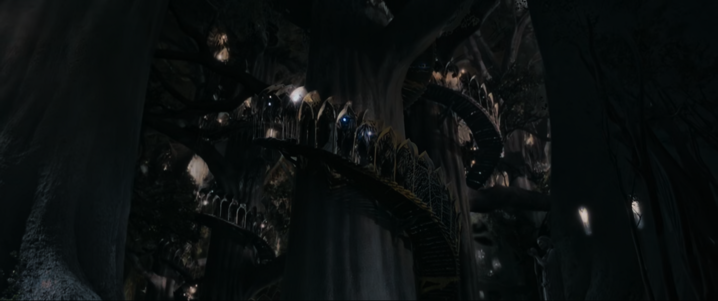 По детализации и наполненности локация города гоблинов из первой части «Хоббита: Нежданное путешествие» (2012 г.) напоминает Лотлориэн из фильма «Властелин колец: Братство кольца» (2001 г.). Однако, если пространство из «Властелина колец» было создано с помощью склейки отснятого материала в бигатурах, декорациях разного масштаба и с небольшим добавлением компьютерных технологий, то в «Хоббите» по большей части окружение выстраивалось в виде 3D модели.