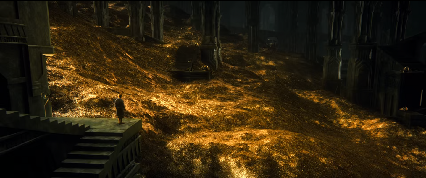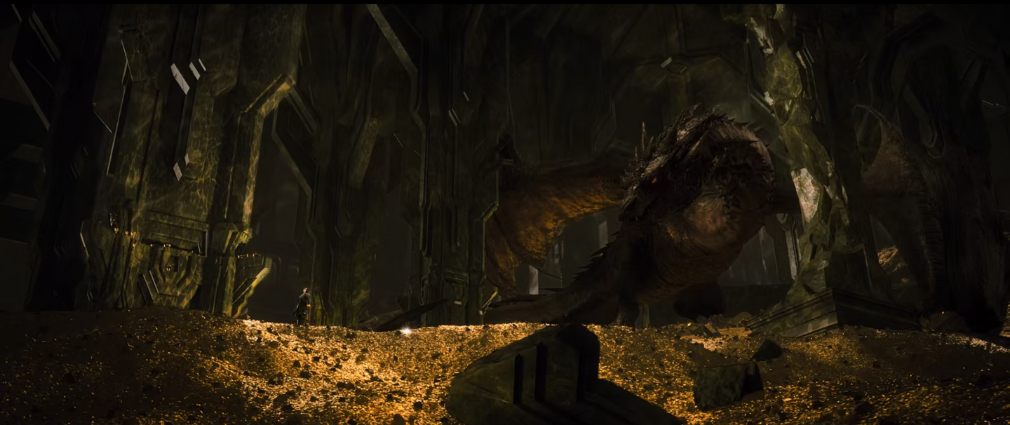 Всё же одна колонна и часть сокровищ были «перенесены» в павильон. Это было сделать с целью отснять движение актёра в сложном окружении. На постпродакшене специалисты по компьютерным технологиям смогли не только соединить рендеры с драконом с актёром, но и сделать анимацию движущихся монет, по которым ходят герои.