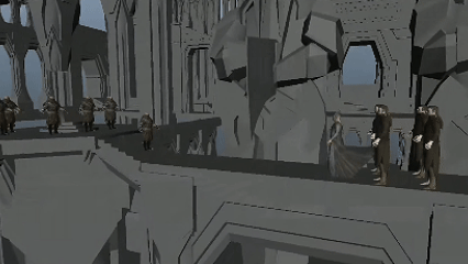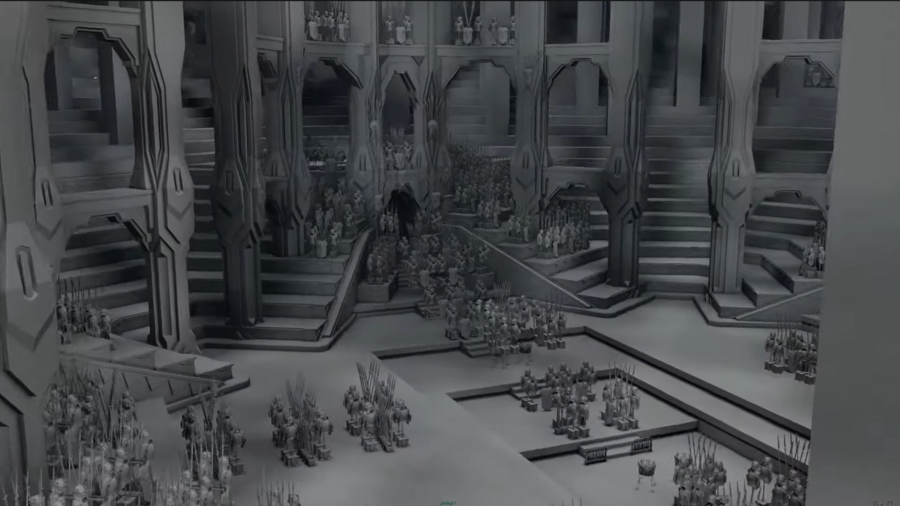 Для событий в тронном зале были отсняты в павильоне все движения и разговоры актёров, из декораций собрали только трон. Остальное окружение полностью воссоздавалось в программе для 3D моделирования. Грамотная работа цифровых художников и супервайзеров по визуальным эффектам позволила убедить зрителя в объёме и натуральности пространства.