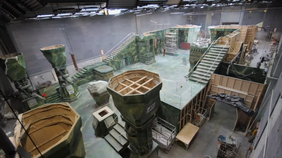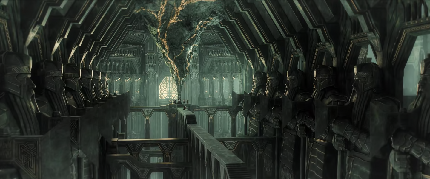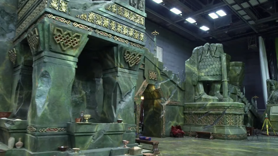 Локация тронного зала Эребора стала ярким примером, того, как с помощью хромакея и выстроенного на компьютере пространства можно создать очень правдоподобное окружение.