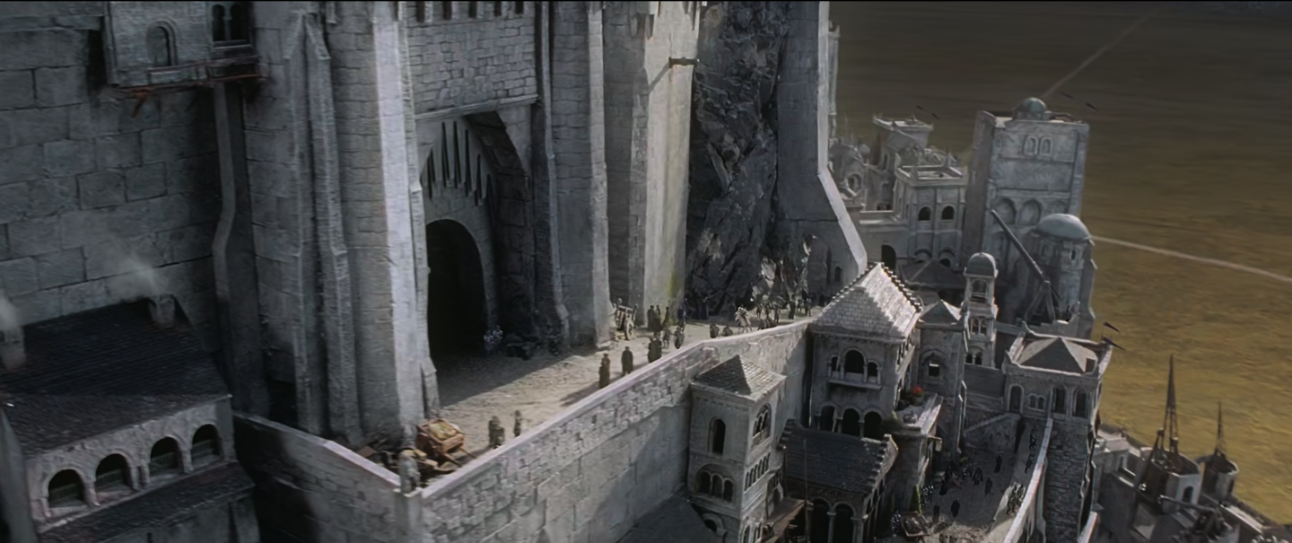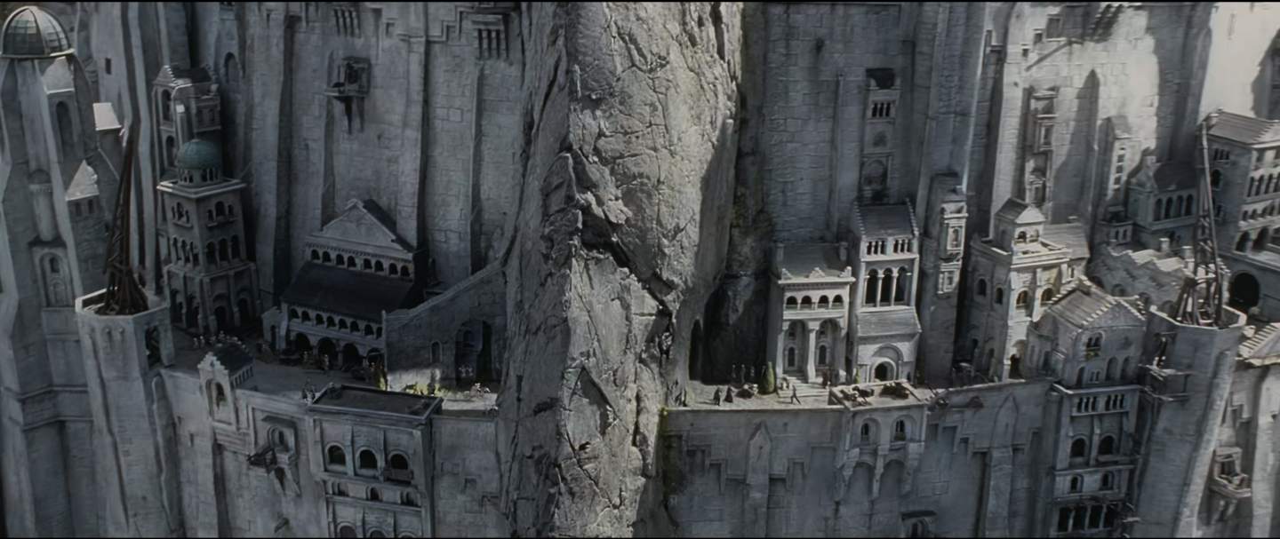Была воссоздана в реальных размерах часть города для съёмок с актёрами. В качестве каркаса биспользовали скелет Хельмовой Впадины, который остался со съёмок предыдущих частей. В дополнительных материалах к фильму режиссёр и продюсеры признавались, что Минас Тирит стал одной из самых больших декораций к фильму, которые были созданы в проекте.