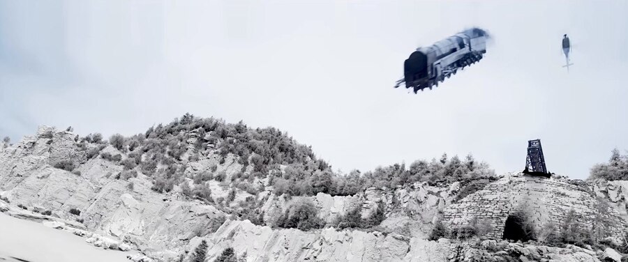 Финальная сцена с разрушением поезда: реальный трюк встроенный в полностью цифровое пространство.