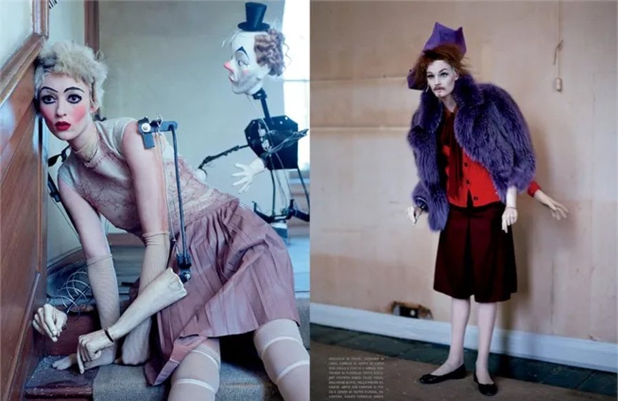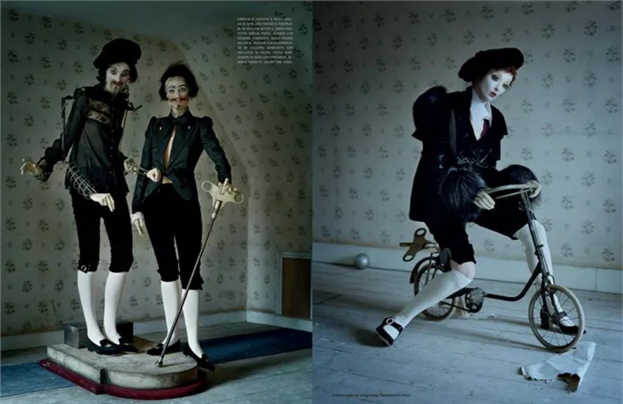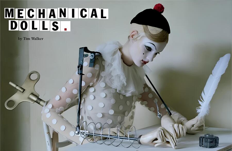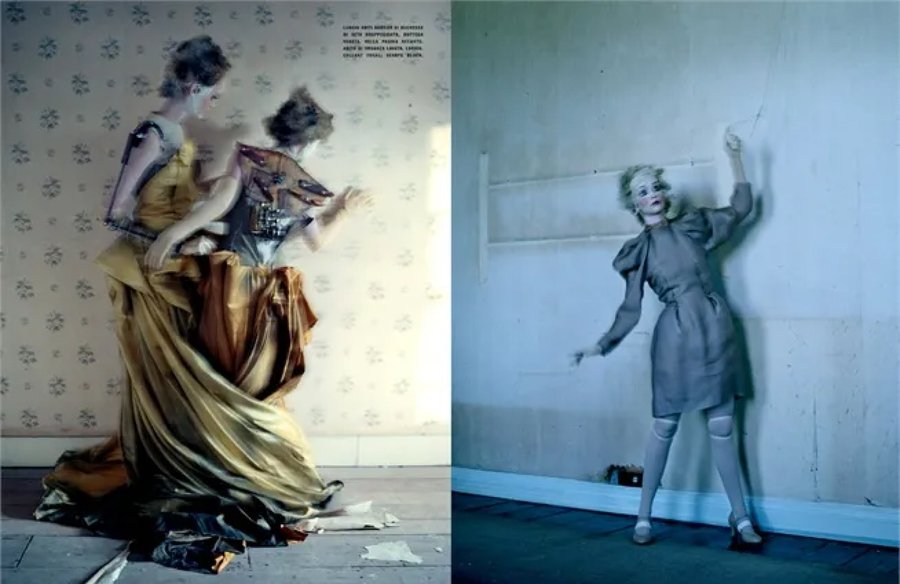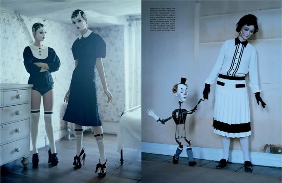 Серия «Mechanical Dolls» Тима Уокера (2011) показывает, как работает это заимствование: огромные кринолины и фарфоровая бледность моделей напоминают викторианские портреты, но сюрреалистические искажения пропорций и механические детали создают сложную игру с историей. Уокер одновременно цитирует прошлое и переосмысливает его, превращая модный образ в высказывание о том, как мы изображаем женское тело. Благодаря такому подходу модная фотография работает на двух уровнях: как реклама для широкой публики и как предмет для искусствоведческого анализа.