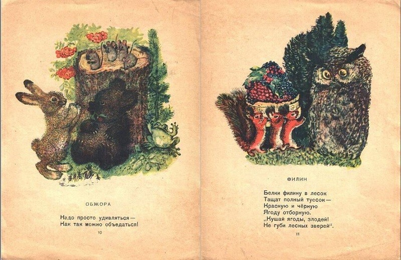 Евгений Чарушин обладал трепетнее всего относил к отображению животных в своих иллюстрациях: через «воздушные» иллюстрации он наделял своих героев мягкостью, уязвимостью, транслируя тем самым неподдельную детскую непосредственность.