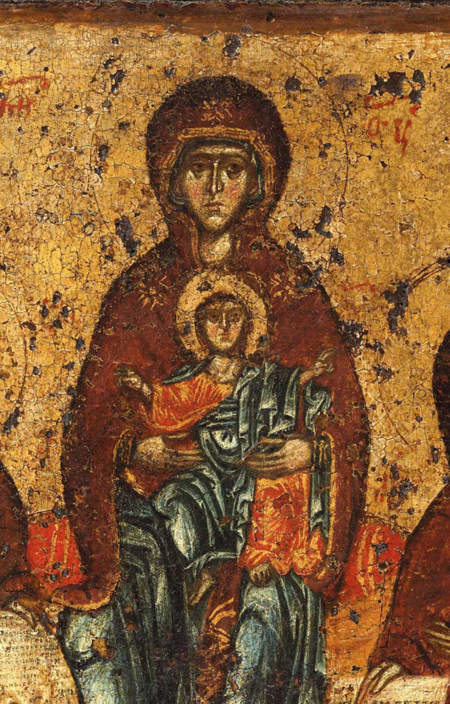 Эта композиция происходит из деисуса — традиционной группы икон, где Богородица и Иоанн Креститель предстоят по сторонам от Христа. Именно поэтому Агиосоритиссу часто называют «Заступница» — она символизирует непрестанное ходатайство Богоматери перед Сыном.