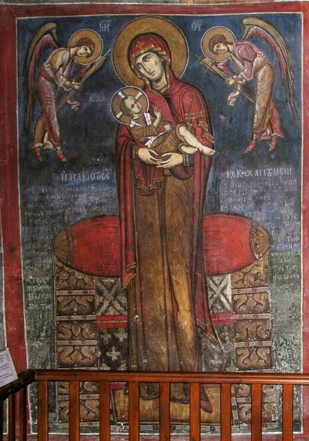 Киккская икона Божией Матери, мозаика на стене Киккского монастыря, Кипр (ΧΙ век); Пелагонитисса, Скопье, Северная Македония (1422 г.)