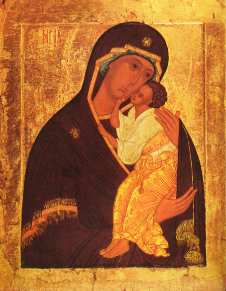 Богоматерь Агиосоритисса («Халкопратийская»), Успенский собор, Москва (Конец XIV — начало XV вв); Деисусная икона Богородицы, Тверь (Первая половина XV века)