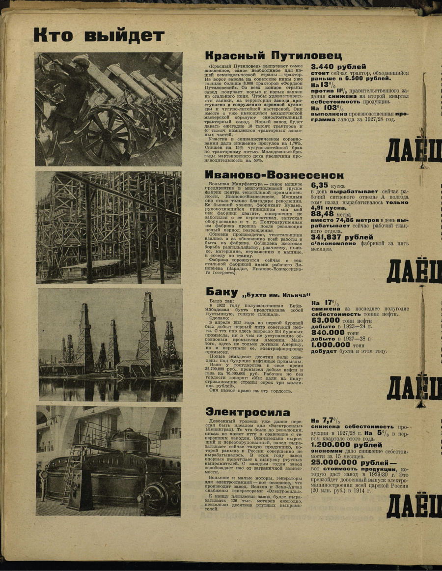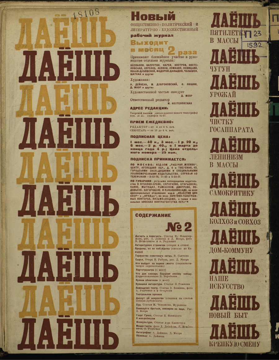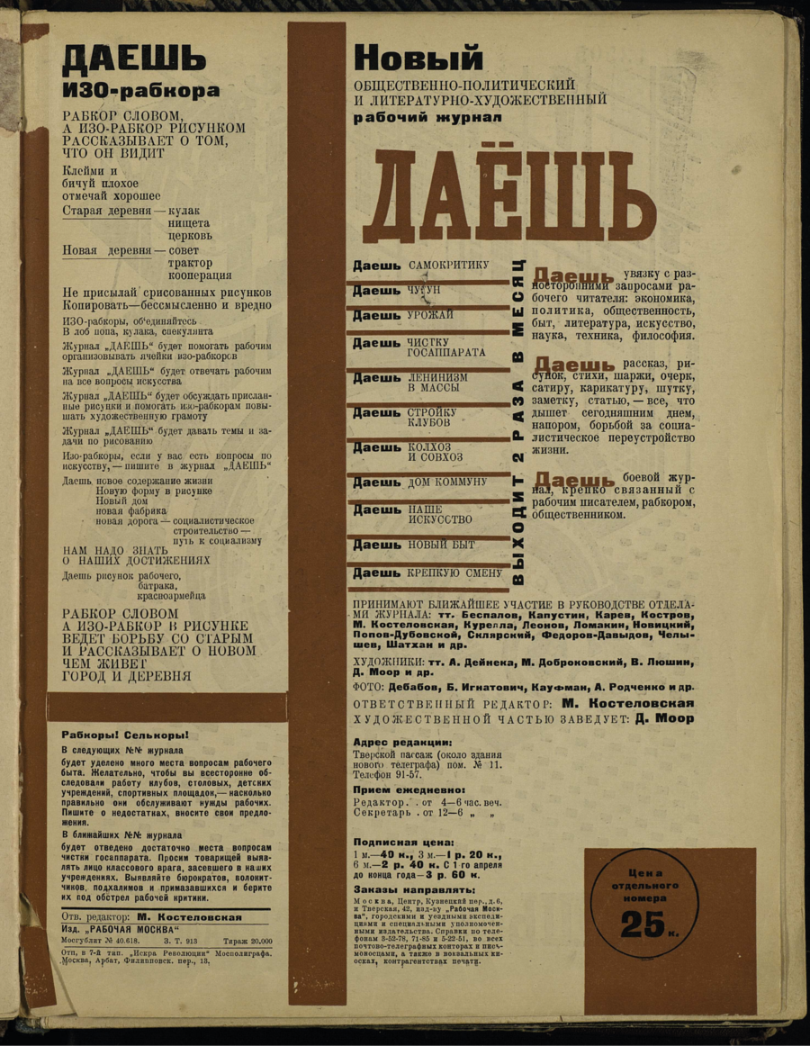 Каждый номер посвящался одной теме, которая раскрывалась под общим призывным лозунгом «Даешь!»: «Даешь чистку государственного аппарата!» (№ 1), «Даешь социалистическое соревнование!» (№ 2), «Даешь пятилетку в массы!» (№ 3), «Даешь внешнюю торговлю!» (№ 4), «Даешь производство продуктов питания!» (№ 5), «Даешь полный ход!» (№ 6) и т. д.