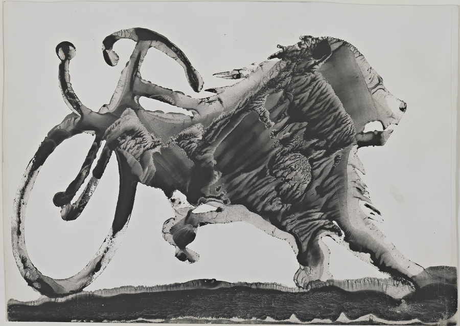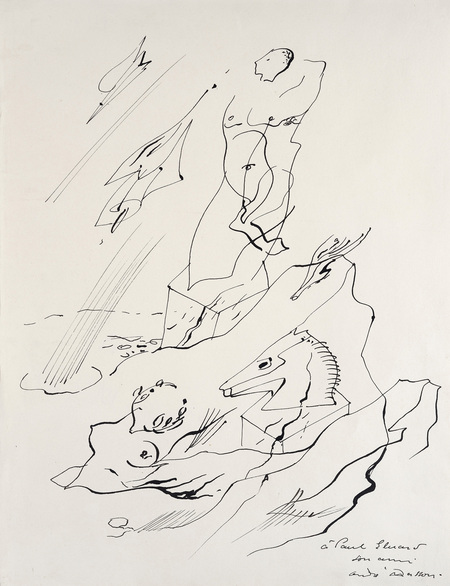 Нечто схожее можно пронаблюдать в «Автоматическом рисунке для Поля Элюара», где образ коня словно собирается из движений, которые сами по себе не обязаны были привести к фигуре. Контур появляется как кристаллизация жеста — не внешняя, а внутренняя. Здесь след раскрывается как феномен: он способен удерживать одновременно и материальность движения, и возможность образа.