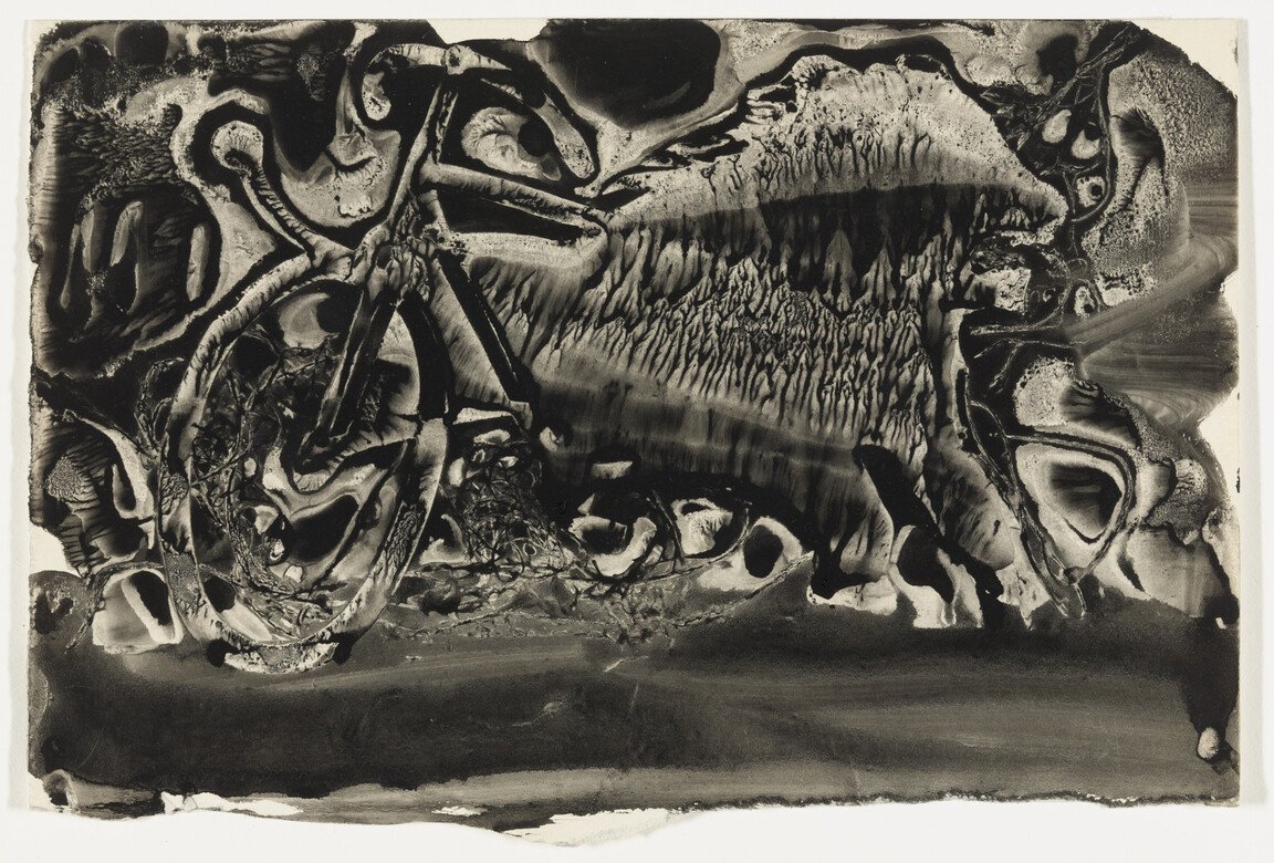 В следующей работе из плотного, почти угрожающего нагромождения разрывов и прожилок проступает велосипед и фигура, похожая на человека в движении. Однако контуры постоянно расползаются — колёса превращаются в клубки органических нитей, детали «дрожат» на границе распознавания. Здесь жест не формирует образ, а как будто пытается догнать собственную мысль, пока жидкость ещё не высохла. Мотив движения становится визуально хрупким: мы видим стремительность, но одновременно ощущаем зыбкость основания, на котором она держится.