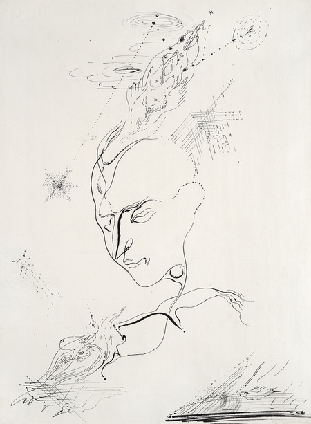 В «Автоматическом рисунке для Бенжамена Перэ», след обретает неожиданную телесность. Из хаотичной сетки жестов проступает фигура головы. Массон не конструирует её, не строит пропорции; он доверяет тому, что след сам приведёт к форме, если её потенциал заложен в движении. Здесь заметно, что автоматическая линия не хаотична, а скорее чувствительна: она улавливает внутренние напряжения и делает их видимыми.