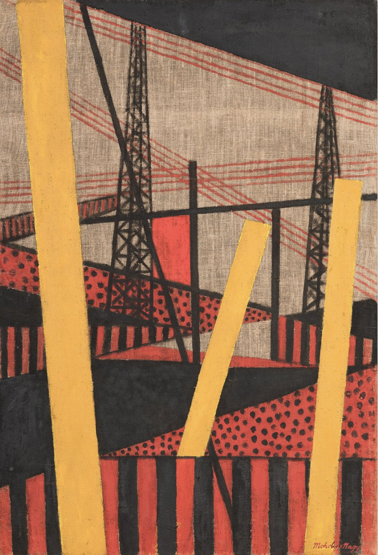 У Мохой-Надя «Радио и железнодорожный пейзаж» представляет собой геометрическую систему: вертикали мачт, горизонтали путей, диагонали проводов. Всё это пересекается по правилам, но без хаоса. Даже красные точки и полосы являются элементами ритма.