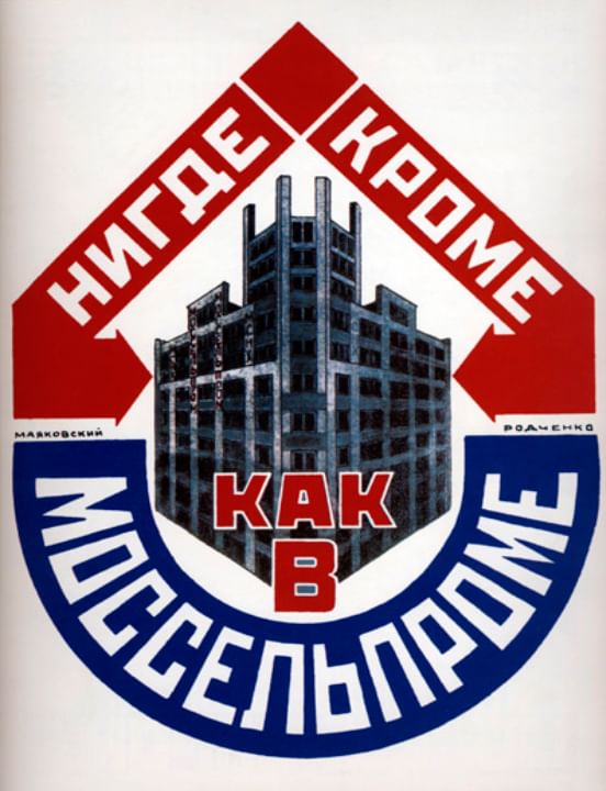 У Родченко композиция служит воздействию: сетка ломается, шрифт кричит, форма означает, фото рассказывает и всё ради действия.