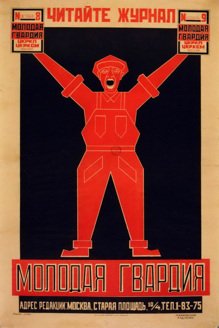 У Родченко надпись «Молодая Гвардия» оформлена жирным, рубленым, чёрным шрифтом на красном фоне и занимает нижнюю треть плаката. Он доминирует во всей композиции. Размер, цвет, положение работают на то, чтобы зритель запомнил название. Это голос, приказ, лозунг.