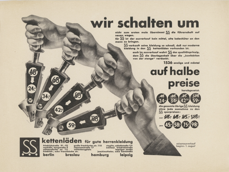 У Мохой-Надя заголовок «wir schalten um» крупный, но не выделен цветом или фоном. Он вписан в общее поле: текст справа от рук, цены в кругах, адреса внизу: всё на одном уровне. Шрифт здесь является частью системы: он информирует, организует данные. Цель типографики в плакате понять предложение, а не запомнить бренд.