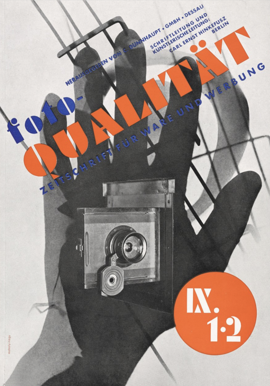 У Мохой-Надя слово «QUALITÄT» вписано в форму руки, держащей фотоаппарат. Оранжевый цвет является акцентным: он повторяет цвет круга с номером выпуска. Шрифт работает как графический элемент, то есть его форма соответствует форме руки и камеры. Отсутствует метафора, но есть визуальная связь между текстом и объектом.