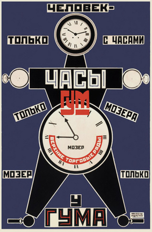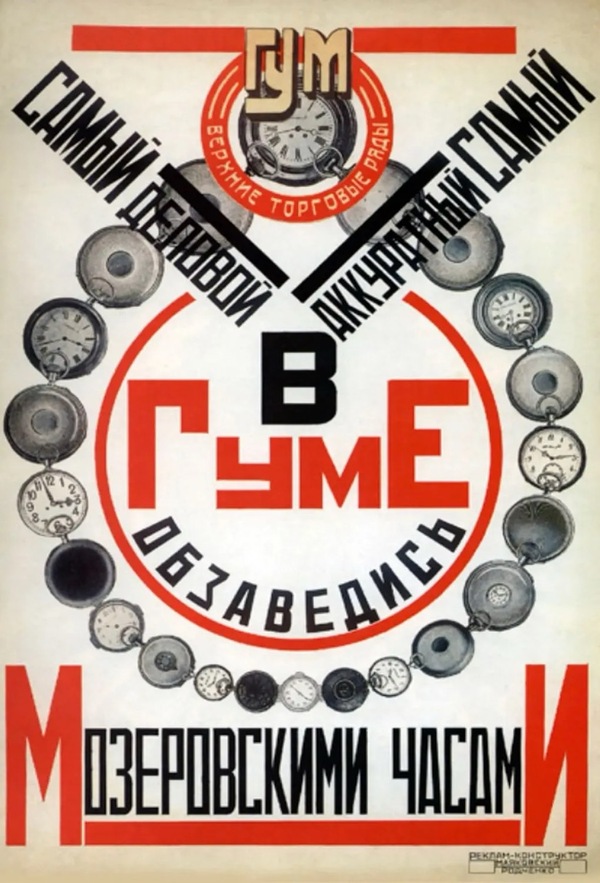 У Родченко часы выполняют функцию не объекта, а символа времени и контроля: круглый циферблат, стрелки, надпись «ТОЛЬКО». Всё это подчинено идее, что человек без часов не полноценен. Форма круга здесь метафора, а не декоративное дополнение.
