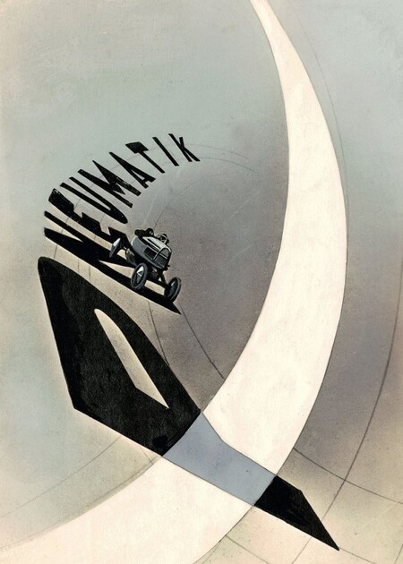 У Мохой-Надя автомобиль на дуге — это визуальная модель скорости: форма дуги создаёт ощущение движения, но не через символ, а через геометрию. Текст «NEUMATIK» вписан в кривую, повторяет её форму. Целью является показать, как форма и движение связаны визуально.