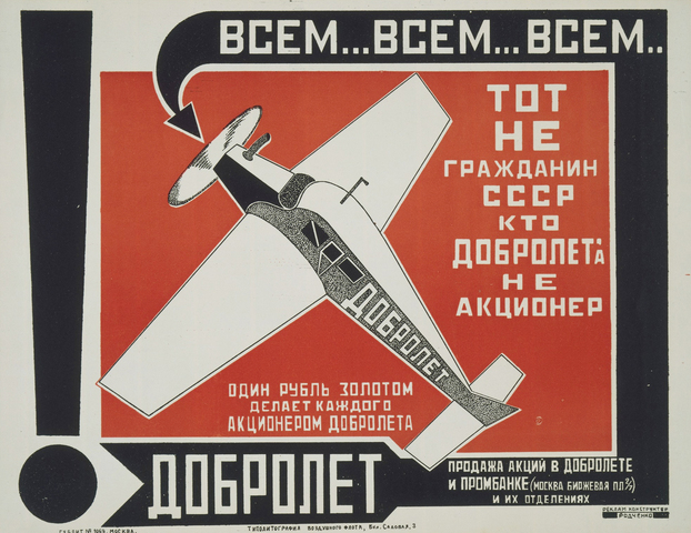 У Родченко самолёт является символом прогресса и коллективного действия: диагональ, стрелка, надпись «ДОБРОЛЕТ» на крыле. Все эти детали говорят о движении вперёд, о том, что каждый может стать акционером. Форма самолёта представляет собой идеологический образ, а не техническую схему.