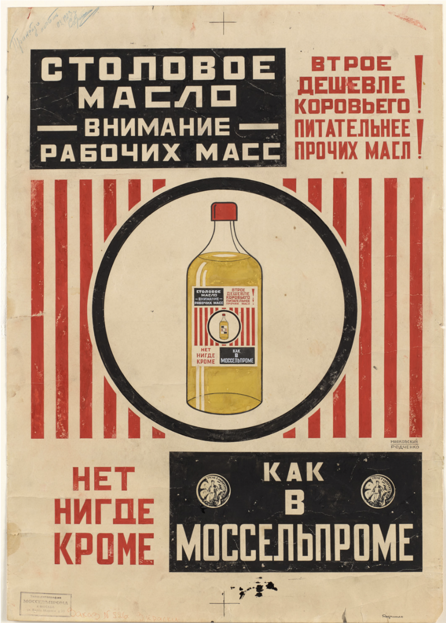 У Родченко композиция выражает идеологию практического преобразования — ключевой принцип советского конструктивизма: искусство должно быть орудием социального строительства. Бутылка масла это символ нового быта, а не товар; круг это гарантия качества, а не форма; красный текст это политический акцент (доступность как классовая ценность). Всё подчинено одной идее: материальные блага являются результатом коллективного труда и должны быть доведены до масс. Композиция здесь выполняет функцию инструкции к действию.