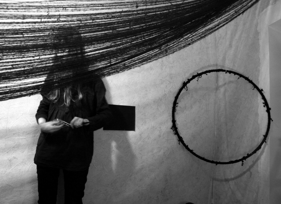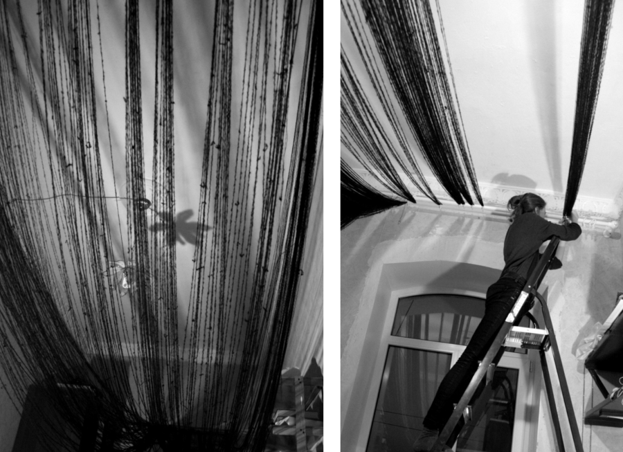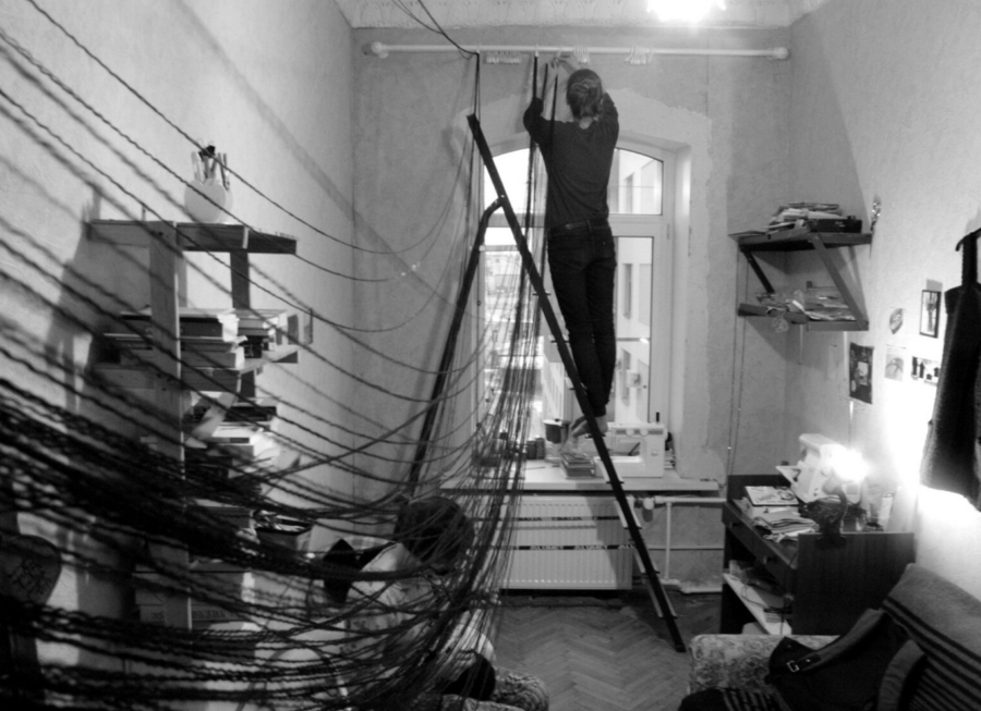 Шерстяные нити будто опускают потолок, превращая пространство в некий футляр или даже гроб. Живущая в помещении Анастасия Макарова становится единственным посетителем инсталляции и ежедневно документирует свои ощущения.
