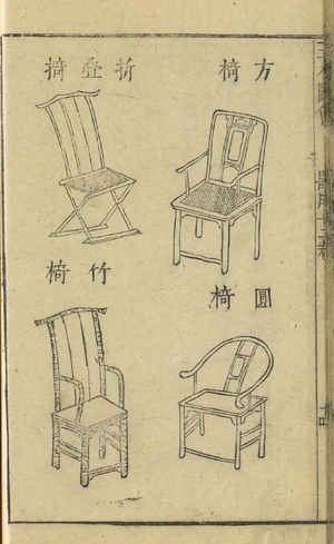 Переход от сидения на циновках к высокой мебели в Китае. На изображении (из старинного источника, такого как «Лу Бан Цзин») показаны различные типы стульев (складной цзяои, квадратный фан и, круглое кресло цюань и и бамбуковый стул чжу и). Эта мебель появилась в период, когда китайская культура сидения изменилась, что привело к разработке эргономичных конструкций с ножками, поддерживающих позу с опущенными ногами (чуйцзуо, chuizuo), которая стала стандартом к эпохе Сун.