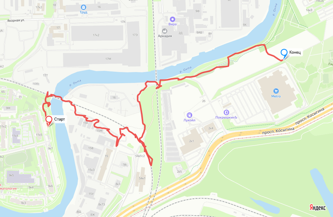 • Точка финала: 59.94198, 30.45687 • Для трекинга прогулки я использовала приложение AllTrails. • Прогулка по «Невидимой Охте» была совершена совместно с коллегой/спутником